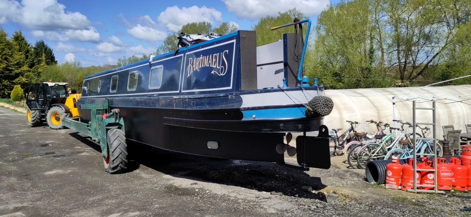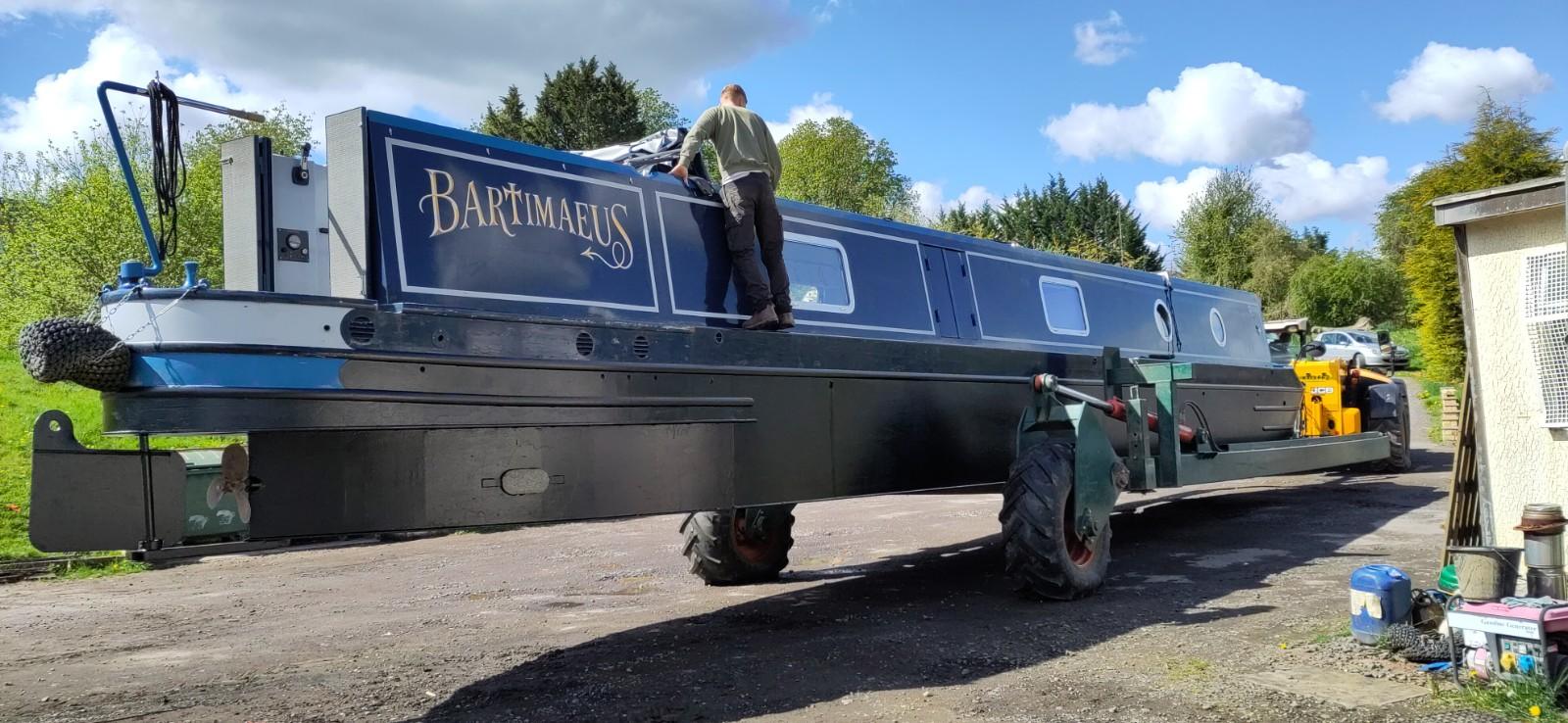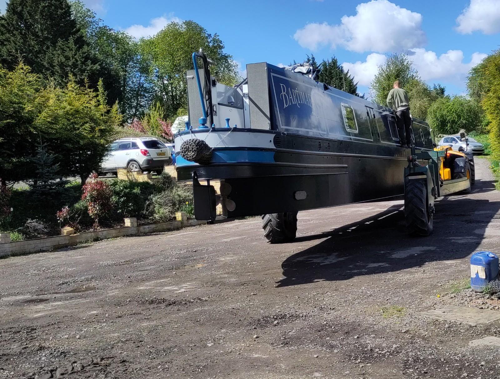 Before getting off, I checked no plates or mugs were on an open space and put things that might break on slide in a cupboard or on the floor. I removed the ladder and got ready to watch the proceedings. I was very impressed by Richard’s ability to reverse a tractor and very very long trailer around a corner and down a very narrow ramp only just wider than his trailer. The width of the canal was not wide enough for a straight reverse across and the boat then had to be controlled by ropes round 2 moored boats on each side of the slipway. It was a pretty tight space to guide the vehicles at each end of the proceedings. A dunt on the other side of canal, fortunately just a soft bit of earth and grass, and a crash of crockery later, (we had way more soup plates than necessary anyway), we were quite soon moored up against the next boat. The assistant had to stand on that boat, when trying to steer Bartimaeus round with a rope but it wat not tightly moored, so wasn’t the most stable place to be guiding from. I did a small amount of pushing to assist the turn, but mainly tried to keep back out of the way.