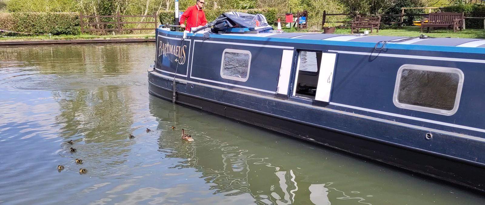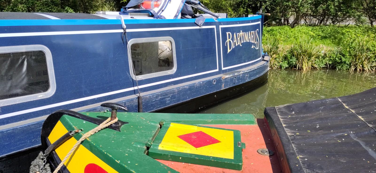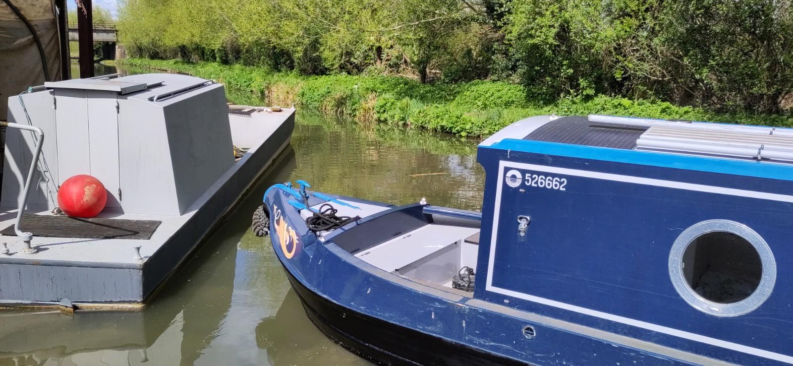 Before getting off, I checked no plates or mugs were on an open space and put things that might break on slide in a cupboard or on the floor. I removed the ladder and got ready to watch the proceedings. I was very impressed by Richard’s ability to reverse a tractor and very very long trailer around a corner and down a very narrow ramp only just wider than his trailer. The width of the canal was not wide enough for a straight reverse across and the boat then had to be controlled by ropes round 2 moored boats on each side of the slipway. It was a pretty tight space to guide the vehicles at each end of the proceedings. A dunt on the other side of canal, fortunately just a soft bit of earth and grass, and a crash of crockery later, (we had way more soup plates than necessary anyway), we were quite soon moored up against the next boat. The assistant had to stand on that boat, when trying to steer Bartimaeus round with a rope but it wat not tightly moored, so wasn’t the most stable place to be guiding from. I did a small amount of pushing to assist the turn, but mainly tried to keep back out of the way.