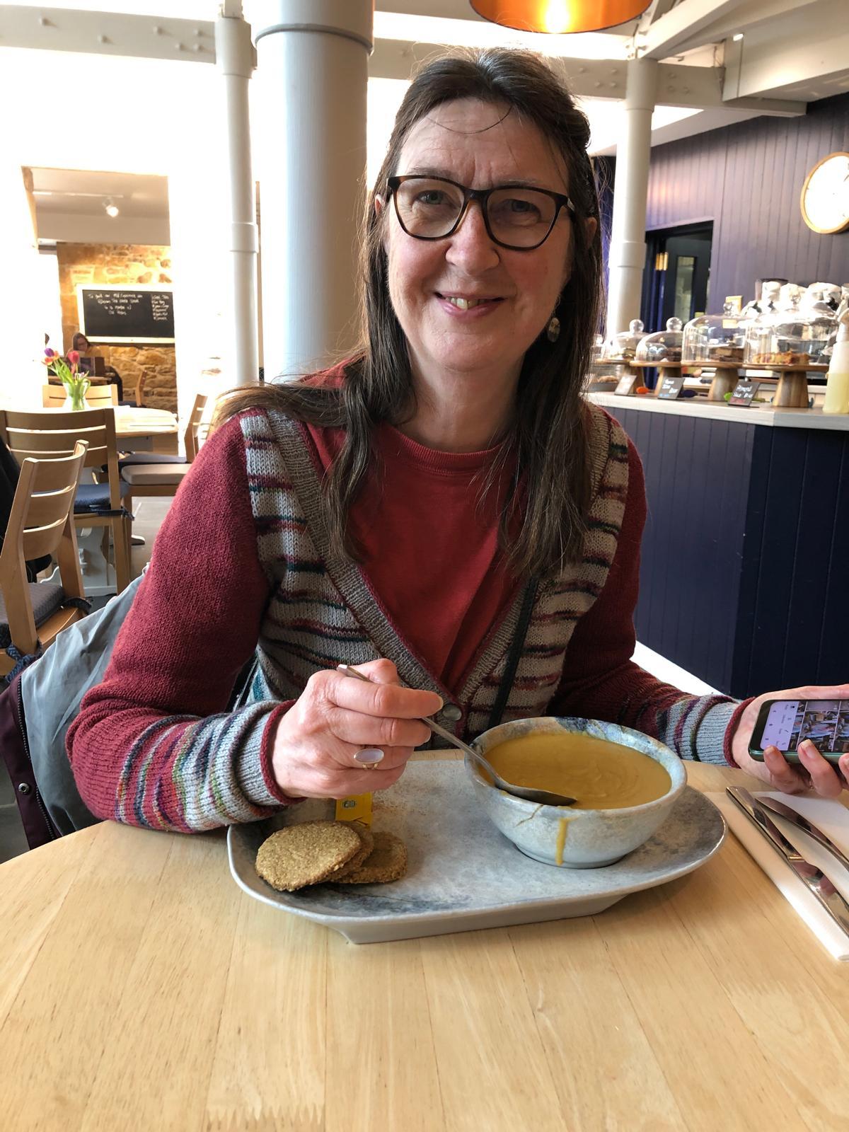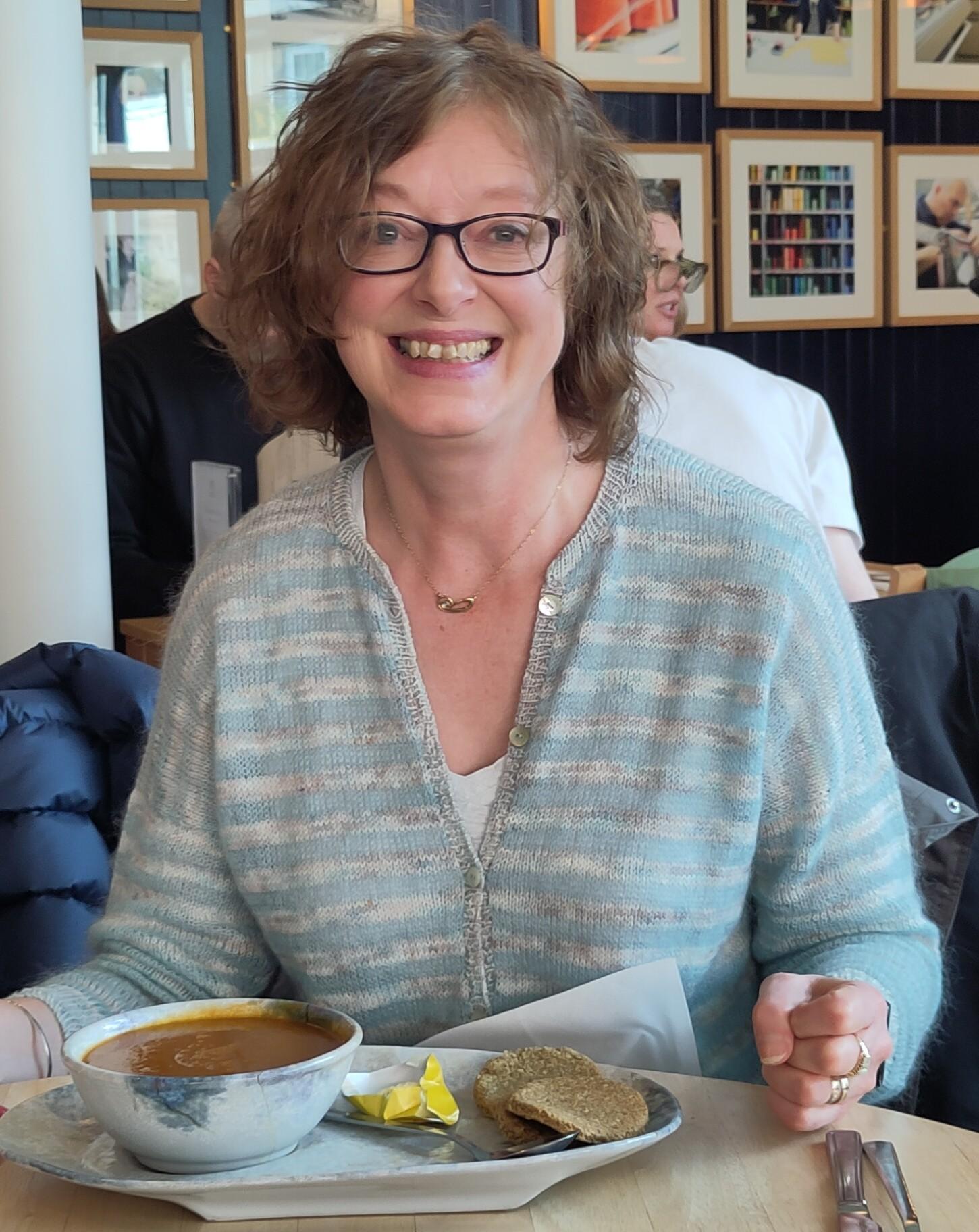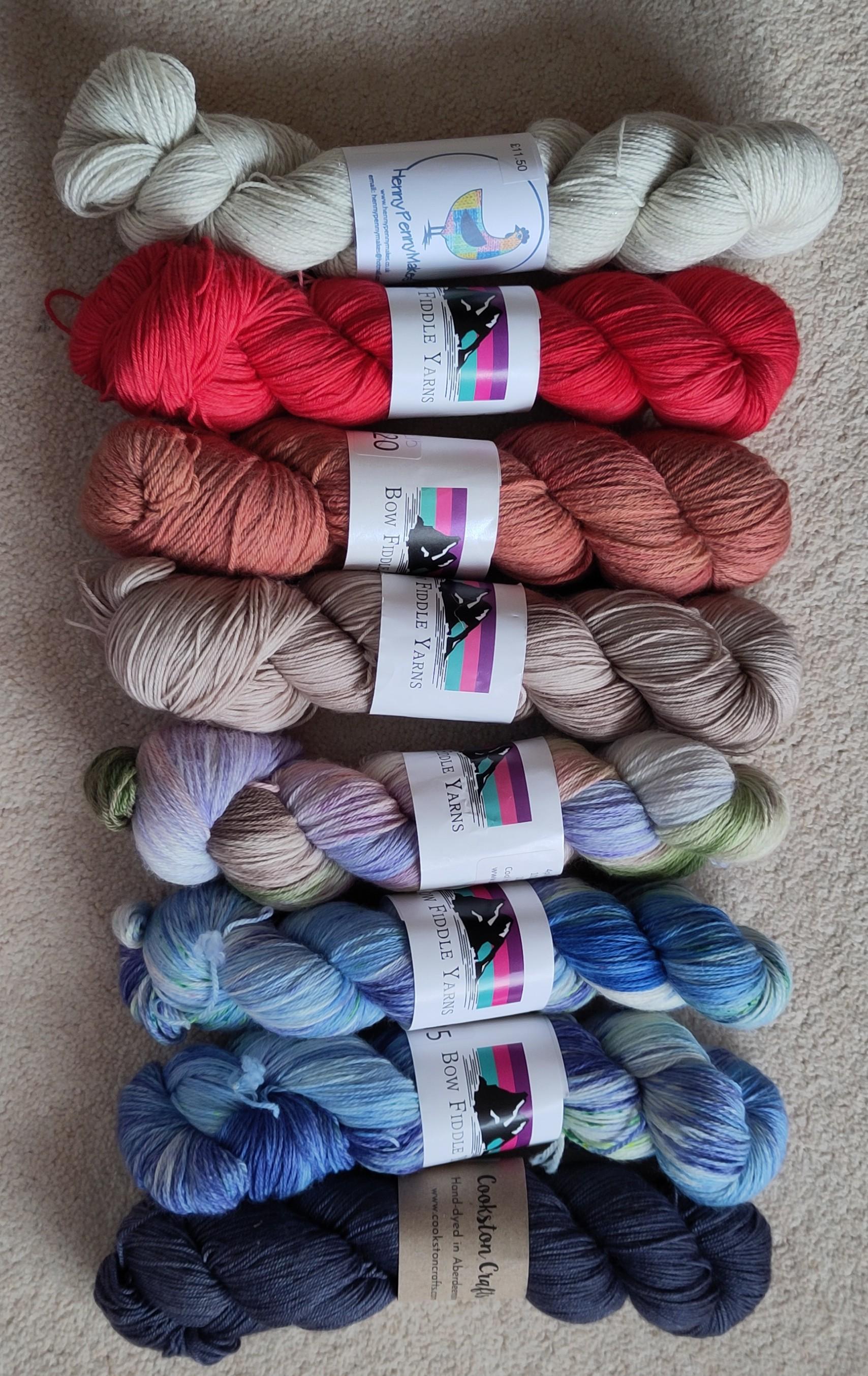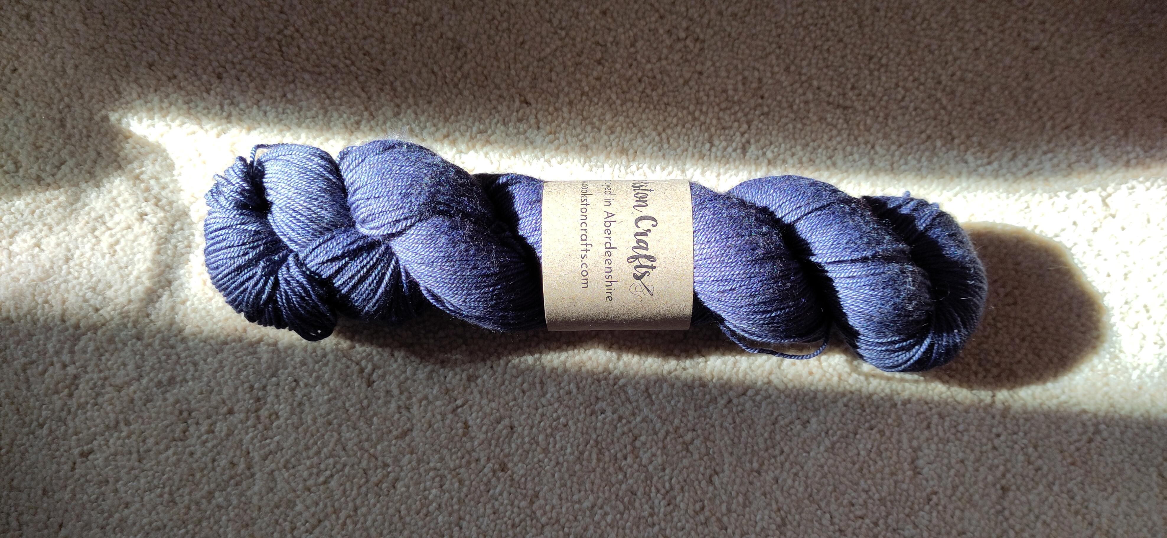 I was overnighting in Aberdeen, where Margaret's son had prepared gyros for dinner while we had prosecco and cashew nuts. This was the life! The next morning Margaret drove us to Elgin where the Moray Fibrefest was taking place. We were immediately entranced by some gorgeous wools and made a purchase each at the first stall - gone was the idea of a browse before buying. Cookston Crafts is a favourite of Margaret's and I have bought from them before too. I remembered something I wanted to re-knit a scarf, as I had lost the one I did for myself before, with yarn bought at my first ever yarnfest. It has been a shade called moody blue , suiting the menopausal mayhem and misery I was going through at the time. I wanted to make it blue again and chose a wool/yak/silk mix, partly as I can't resist a yak yarn, but also because silk had been in the original moody blue scarf. The new skein was called sapphire, a deep purplish blue with a bit of sheen. No photo do colours justice, even with sunshine on it.