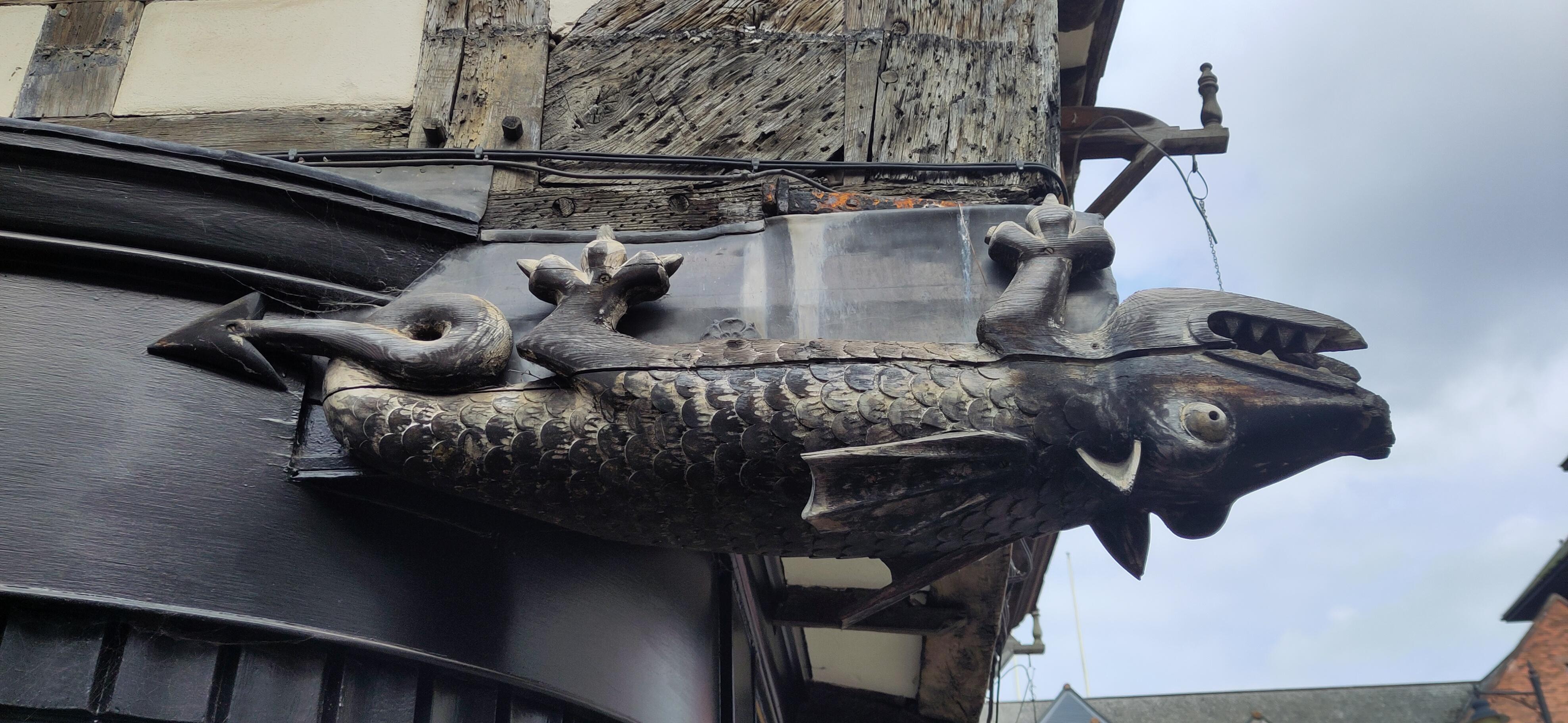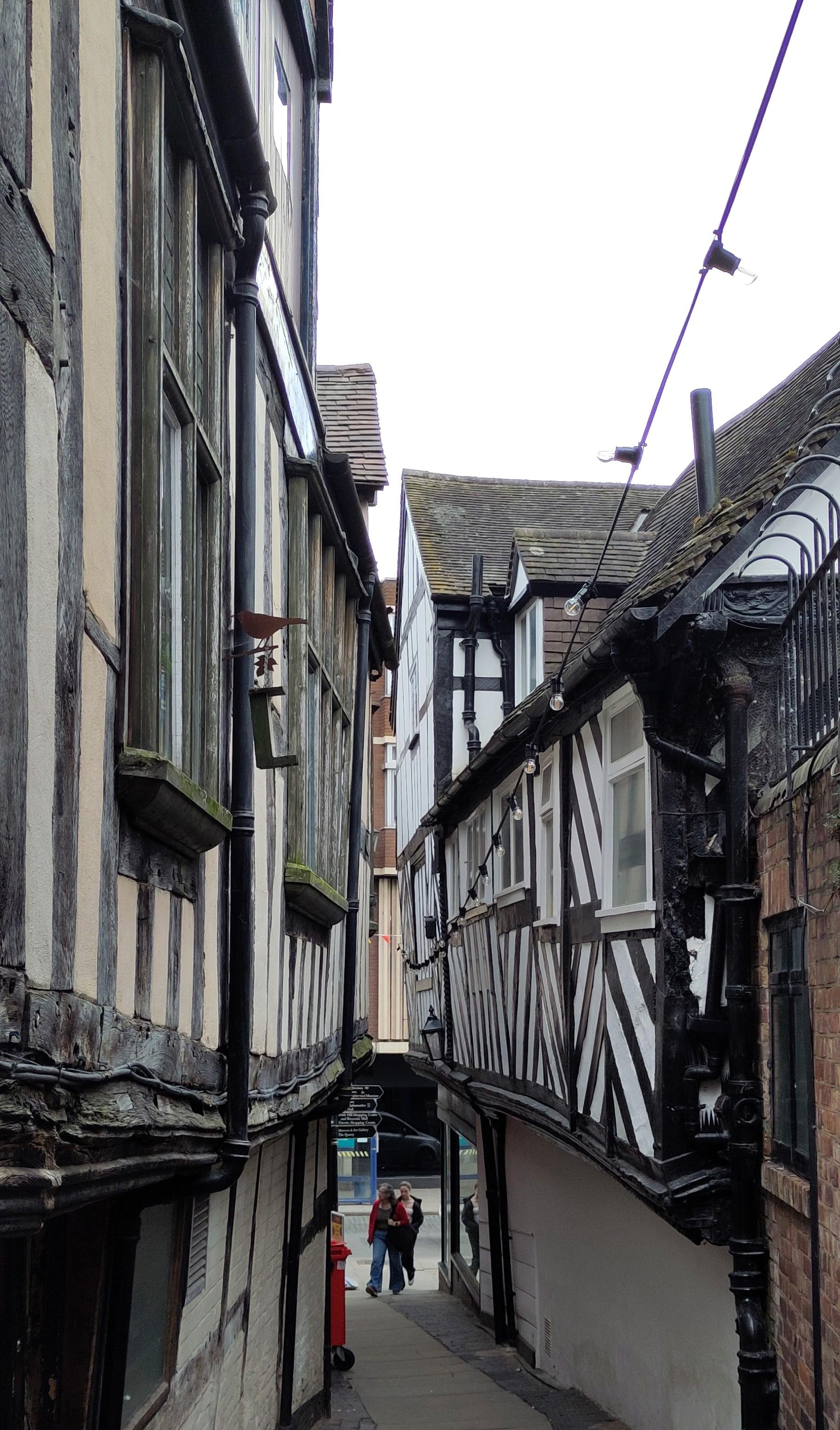 Shrewsbury had been recommended and it was no surprise that it was full of black and white timbered buildings, but someone was going to great lengths, or heights, to get a picture. He was getting an interesting view of the opticians with the longest selfie stick ever, or a view somewhere else.