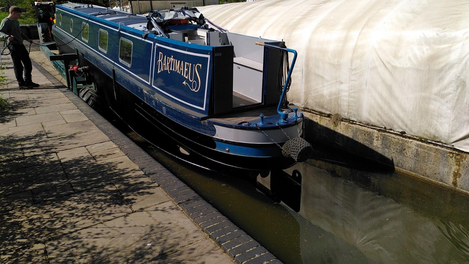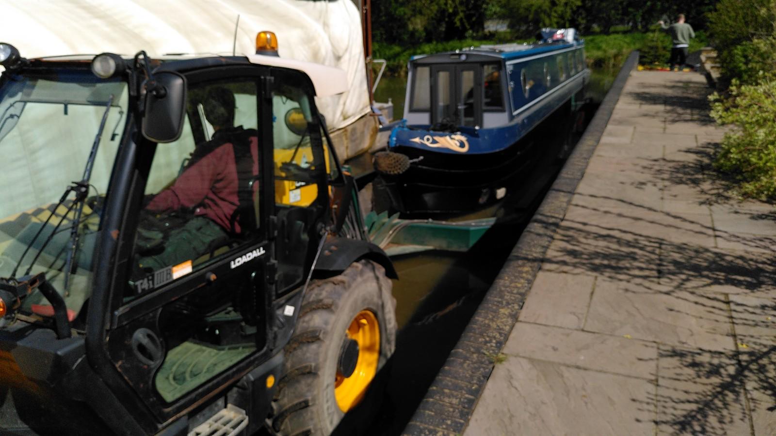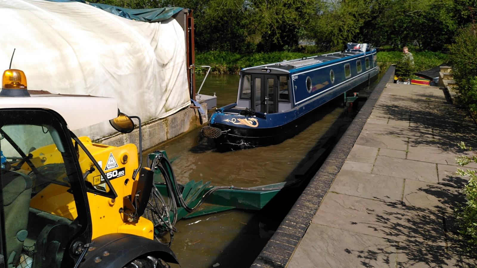 Once level again, the boat was pushed further out in to the canal. The trailer was still supporting the bow, so the stern was pushed underwater much more than usual. This is when the plug in the exhaust was doing its thing. The back of the boat reached the opposite bank of the canal before it was fully afloat. With Simon hauling on the rope, Richard drove up and back a few times until the trailer slid out from underneath. Some more rope hauling and Bartimaeus was ready to board. It wasn’t a very elegant launch, but effective.