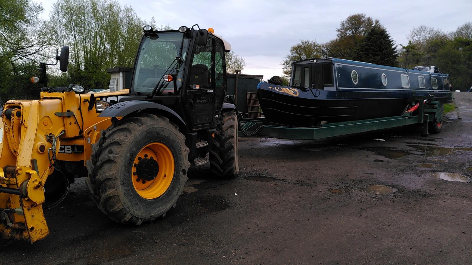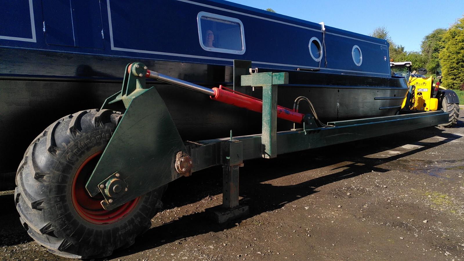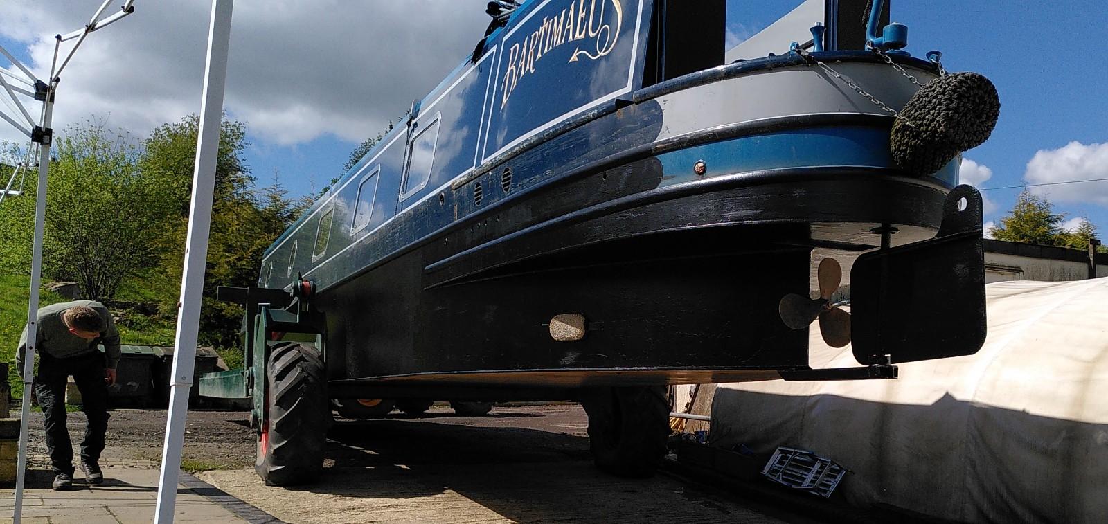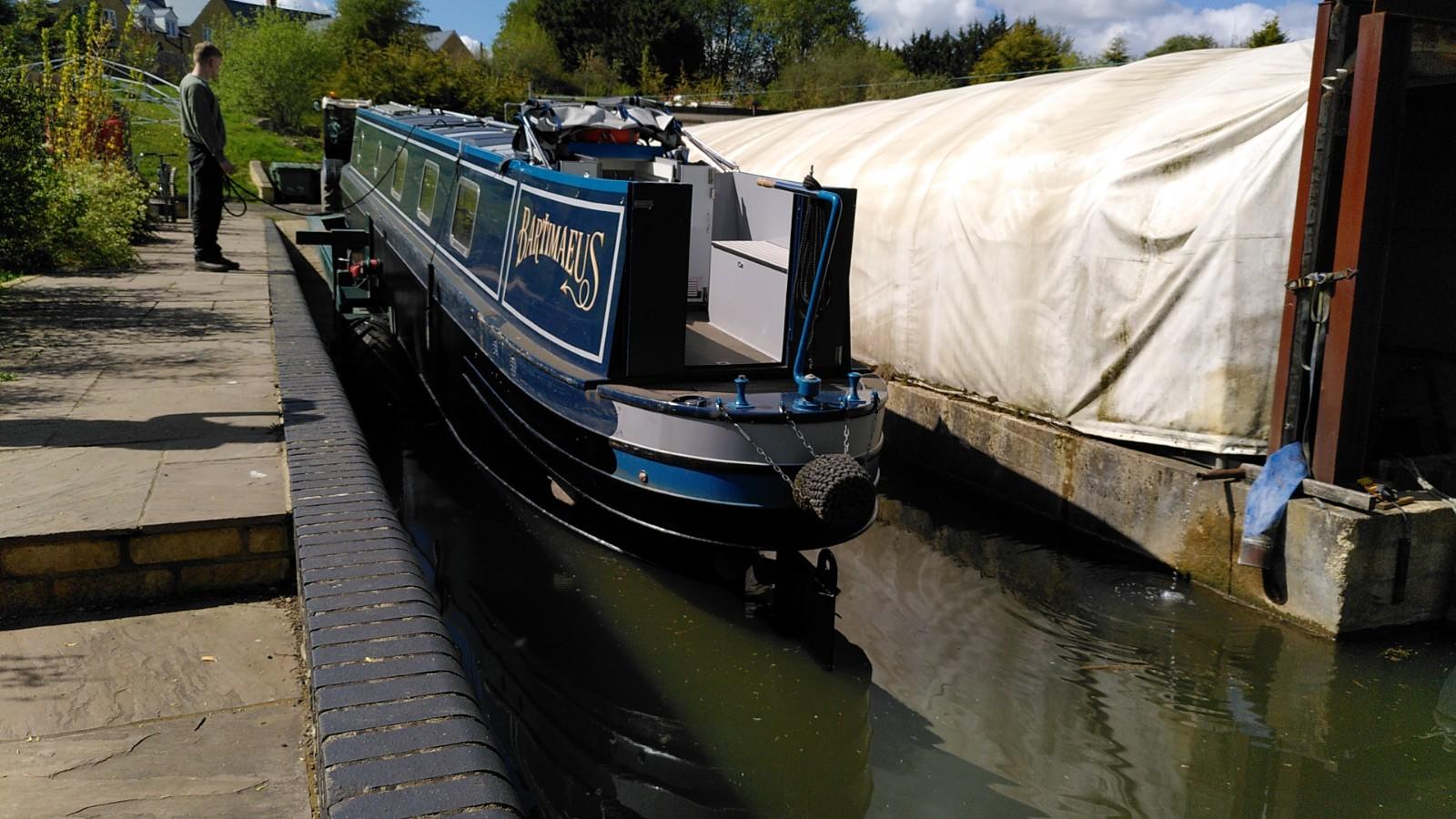 Once level again, the boat was pushed further out in to the canal. The trailer was still supporting the bow, so the stern was pushed underwater much more than usual. This is when the plug in the exhaust was doing its thing. The back of the boat reached the opposite bank of the canal before it was fully afloat. With Simon hauling on the rope, Richard drove up and back a few times until the trailer slid out from underneath. Some more rope hauling and Bartimaeus was ready to board. It wasn’t a very elegant launch, but effective.