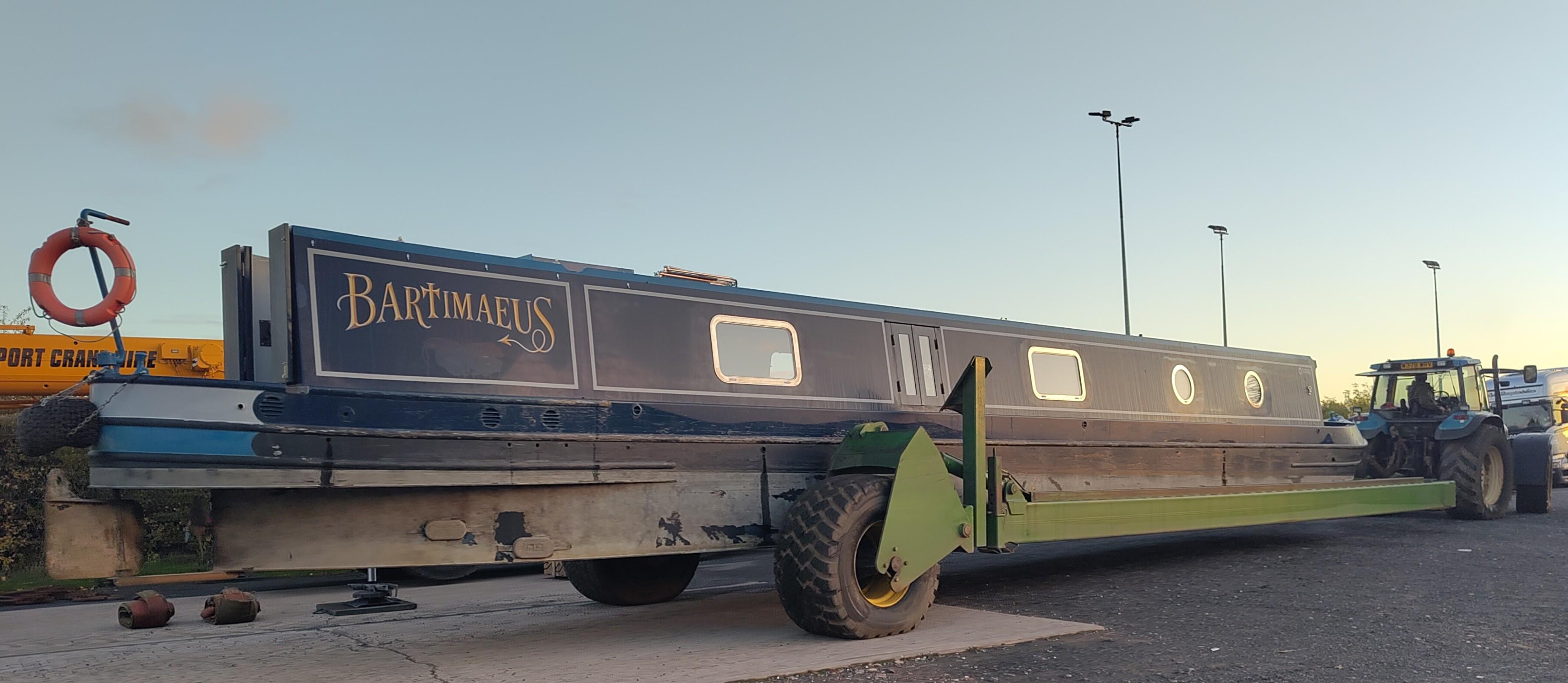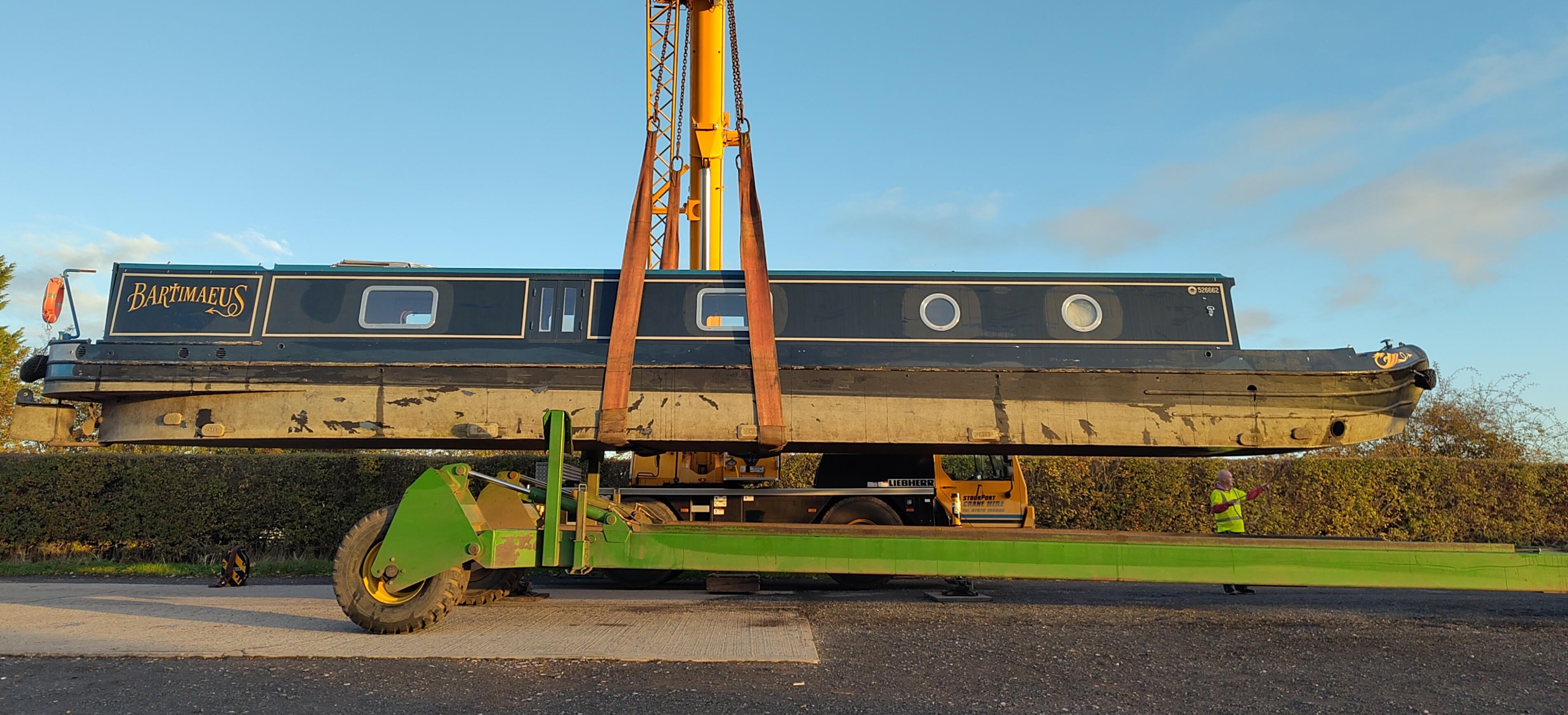 Before we'd finished, I could see that Bartimaeus had arrived outside the unit. The next bit of the operation was to swap places with NB Albatross, a brand new boat that was coming out for launch in Milton Keynes. Before we got on the train, Bartimaeus had been moved inside the building.