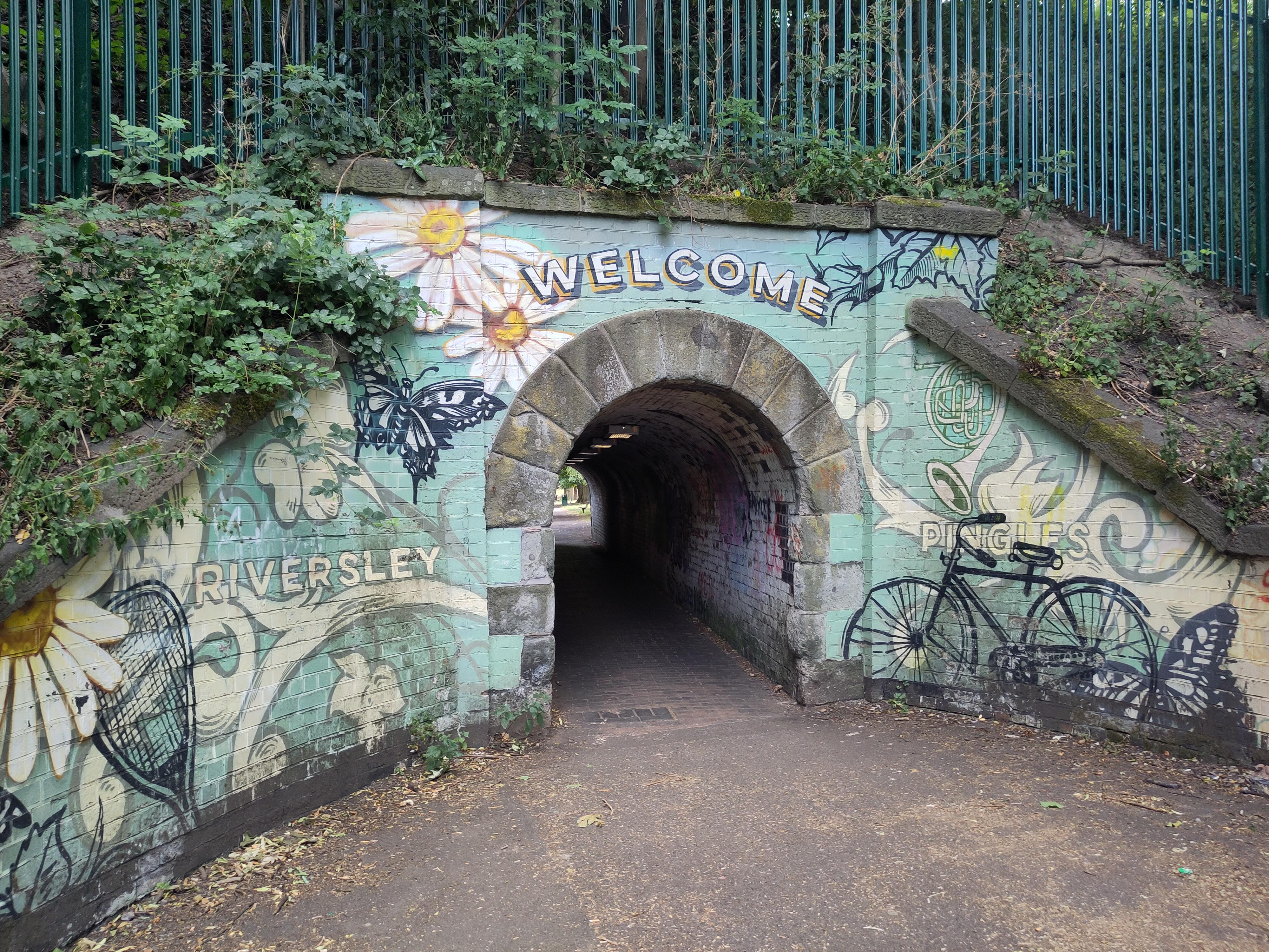 My first full day aboard, we cruised onward to Nuneaton, which would have been the next stop had I not gotten off the train at Atherstone. We saw many ducklings and moorhens along the way, which were in varying stages of "tiny chick" to "delinquent teen". I also spotted a frog scooting across the canal, a lucky sighting. Arriving in Nuneaton, we explored the town and did a bit of shopping, as well as some squabbling about how much we all didn't mind where we went next. Riversley Park had an interesting tunnel with murals around the outside depicting nature and sporting activities, and the town felt vibrant even with it being a quiet evening.