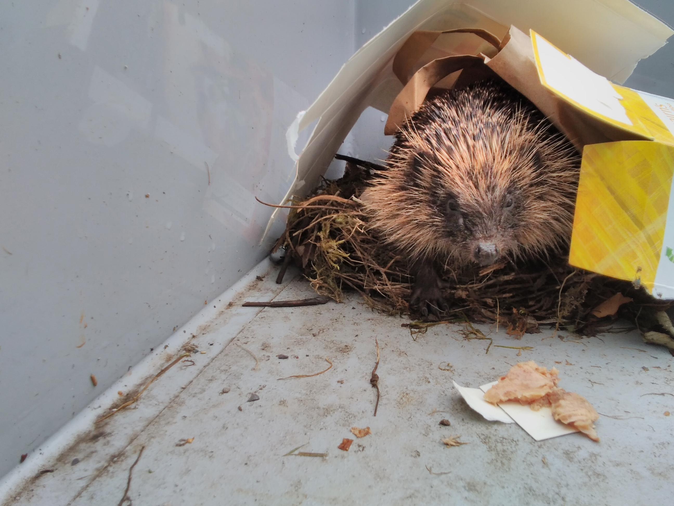 We had left the Leigh branch of the Leeds and Liverpool canal and turned into the main Leeds and Liverpool. We headed for the next lock and the rain was getting quite heavy. Everything is a bit awkward being wide and the winding is high up and there are anti vandal locks on them to open up with a ” handcuff key” (though there are no handcuffs). On this one the anti-vandal locks have been vandalised! They were filed down. That made it a bit easier for me. The lock was nearly empty and I was looking in to see if it was ready to open when I thought I saw a dead rat floating in the water, a bit bloated. Then I thought the legs were moving. Were they were being moved by the flow of water, or was it swimming? It didn’t have a long tail like a rat… Then I saw a head come up and then submerge again. “Shane! I think there is a hedgehog in the lock!” Shane came to look then sprang into action – he got the gangplank off the roof and standing on the bow, tried to reach the hedgehog, but it was now in the far corner of the lock. He moved the boat forward in the lock and tried to get close enough. Eventually, he got the gangplank under the hedgehog, but only the front of the hedgehog was on it and it fell back unable to get its hind legs on, or unaware of was being rescued. This happened repeatedly with Shane calling entreatingly “Come on, Mr Hedgehog!” I was afraid Shane might slip and fall but he assured me he was stable. I thought if I pulled the bow rope I could bring the boat right into the corner and Shane threw it up to me and I pulled it over a bit. Shane got an idea that putting the rope under the gangplank, might help with the lifting. He directed the plank I pulled the rope to raise it gradually when he’d got it below the hedgehog. At last we got it. It was wet through and exhausted.