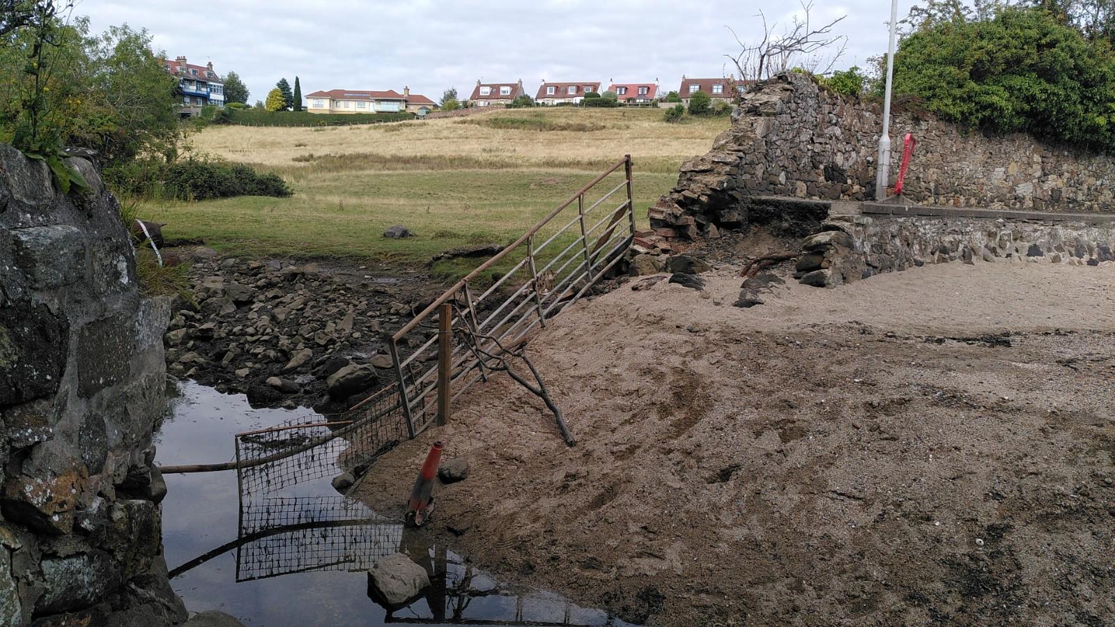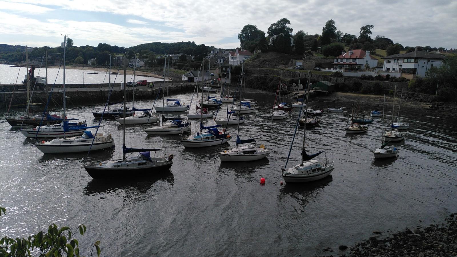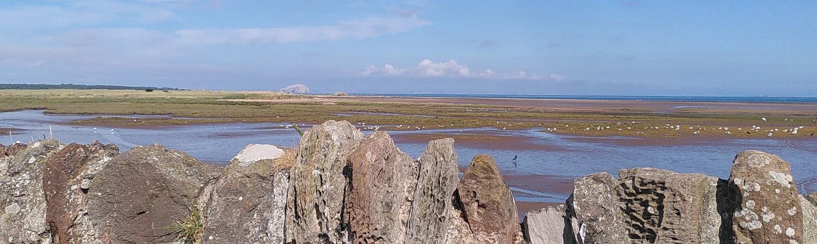 Lunch was in a cafe in Burntisland before continuing along the path to Aberdour. The majority of the walk affords a splendid view across the Forth Estuary to Edinburgh. It is about five miles across the water, but more than twenty to go via the Forth Bridge. After another cafe visit at the beach, we had just enough time to walk around the headland before the next train. At the harbour, it turned out the bridge had been washed away in the winter storms. With the low tide, we were able to hop across on the unofficial stepping stone – clearly we were not the first to do this.