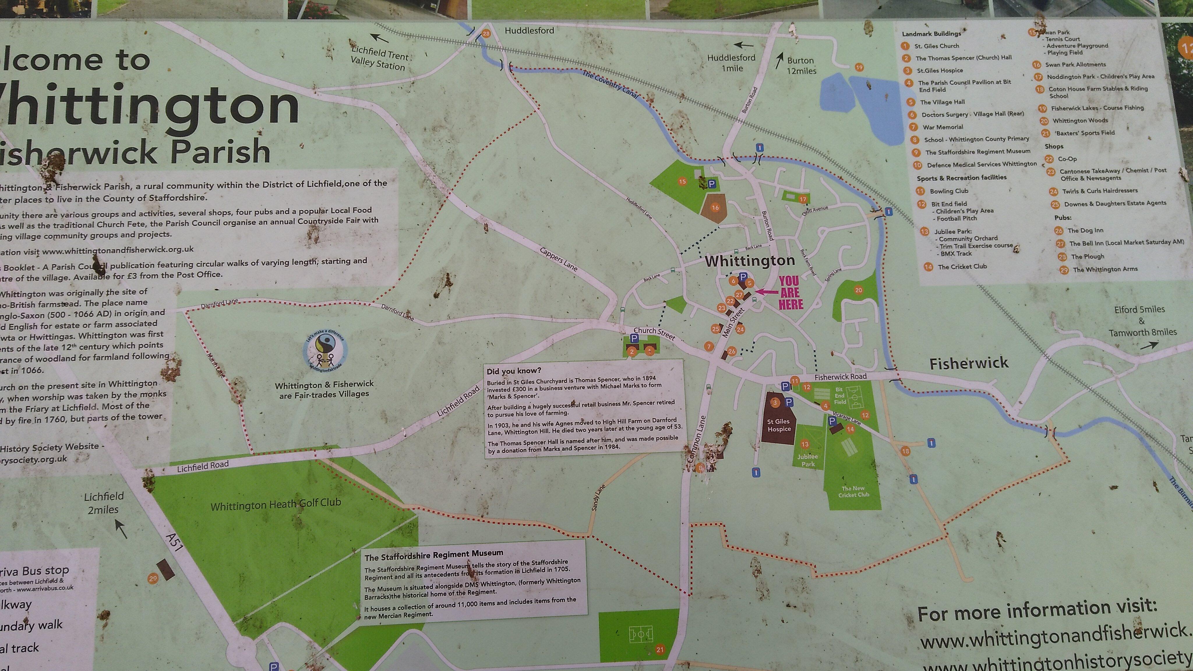The village of Whittington isn’t big but had a well stocked shop, 4 horsewomen passing by and a map at the village green where it was revealed that one of the founders of M&S was from Whittington. He had retired here to take up farming – obviously someone who liked to be busy. The village shop is not an M&S but they provided some funding for the village hall. It was an informative map and, thinking I might take a different route back, I took a photo of it. I did consult it once to confirm my route, so was glad to have it. I did meet other people on the way back and one man said good afternoon. I really hadn’t realised it was that late, as usual.