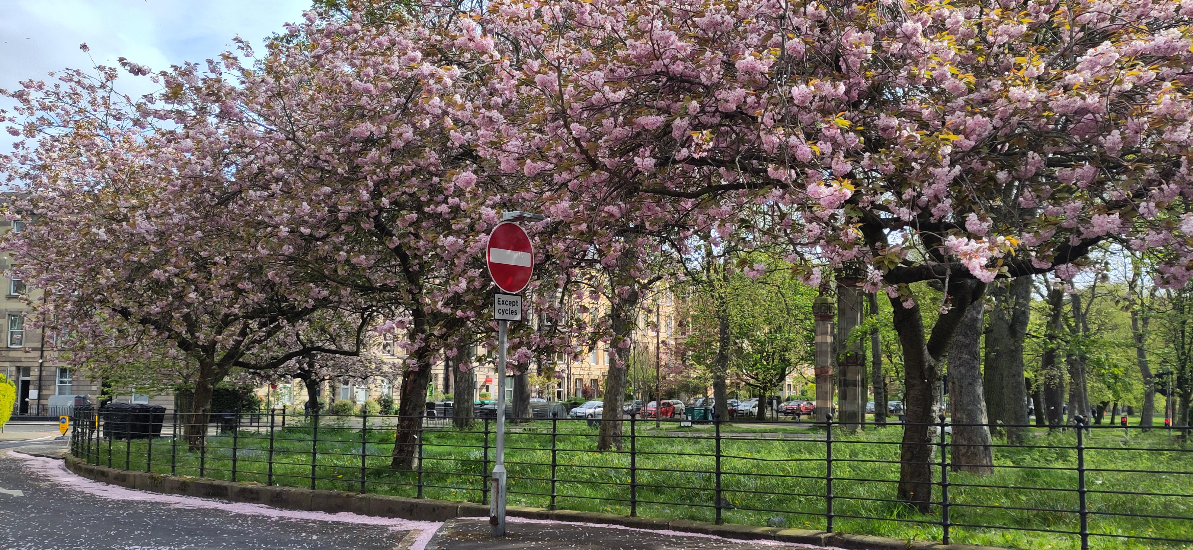 This was not a long winter visit to Edinburgh, more a short Spring fling. On my way to meet my sister for a walk, I noticed swirling pink petals in front of me. They were like snowflakes, except it wasn’t cold. The blossom was already beginning to fall. There are thick bunches so I hope they cling on. This weekend our friends are hosting a cherry blossom party to celebrate being a year in their new Quartermile flat, with a Birdseye view of the Meadows. Unfortunately I have had to decline as we will both be gone by then, but lets hope that not all the blossom has. I am sure they will have fun without us or the cherry blossom. If you zoom in to some of the pictures you might see the petals falling.
