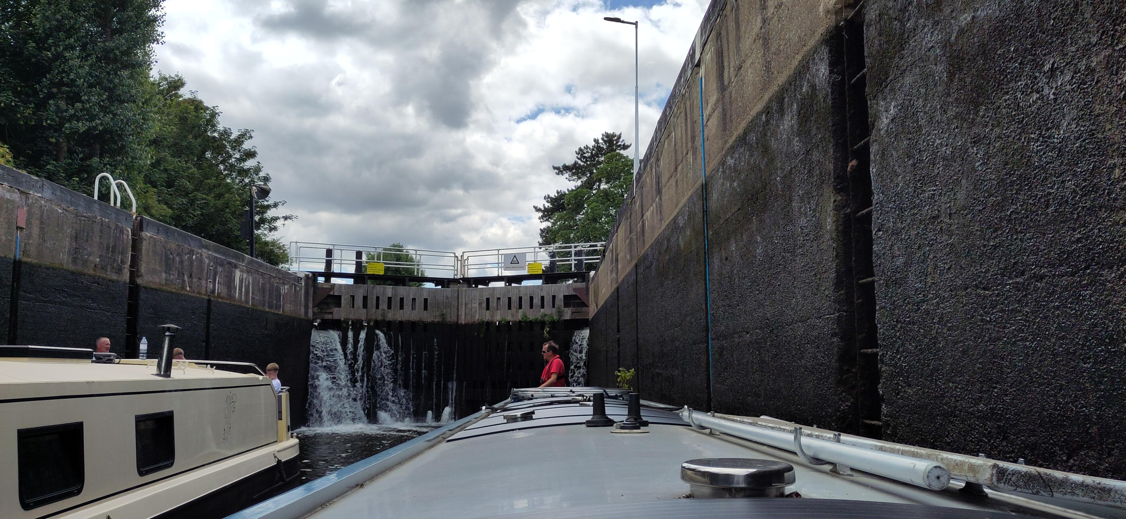 The lock keeper had a chat to me, while it emptied, about travelling by narrow boat He had had a share in a boat but being a fixed place mooring it limited exploration of the network. He had sold his share but was planning a trip to Scotland on a cruiser to do the Caledonian canal. That is a more suitable boat for that trip. I told him to look out for Nessie. He was very friendly to us, giving Shane a card with the numbers for phoning locks ahead, so they could start setting them out way in advance, definitely not a service at the Thames. He waved us away and it’s the first time I have been blown a kiss by the lock keeper!