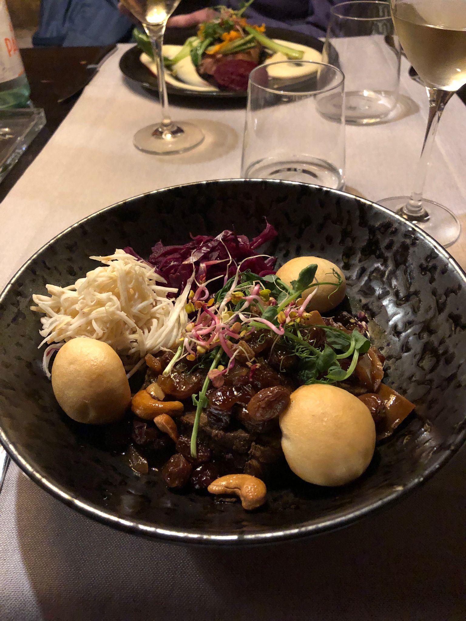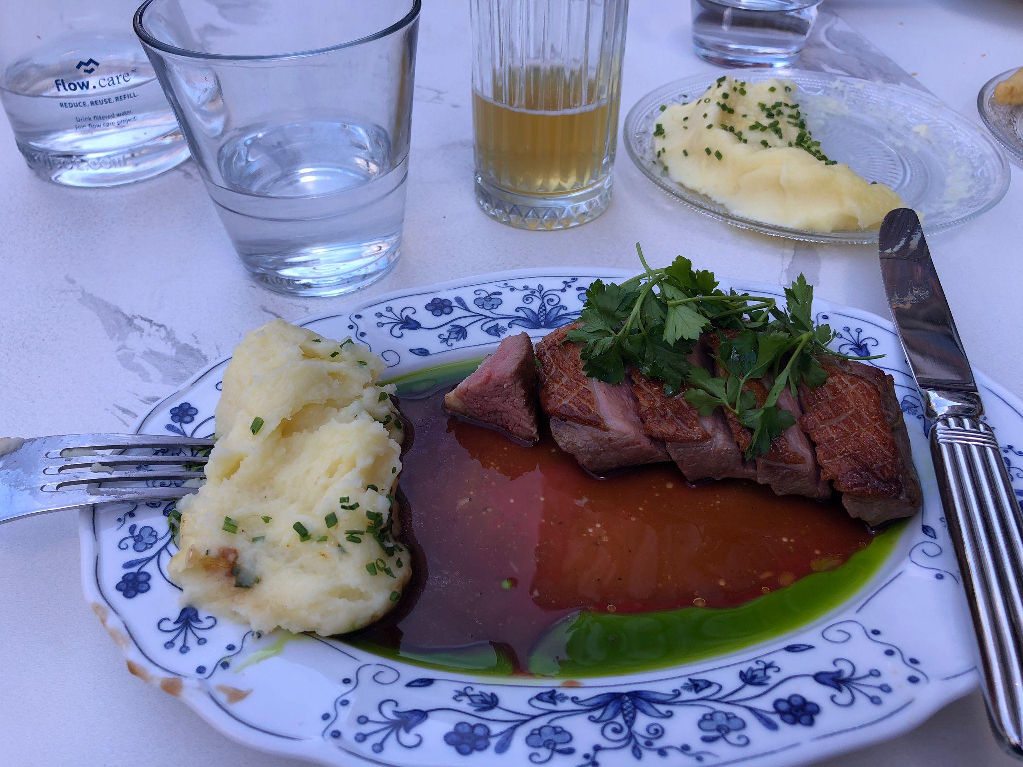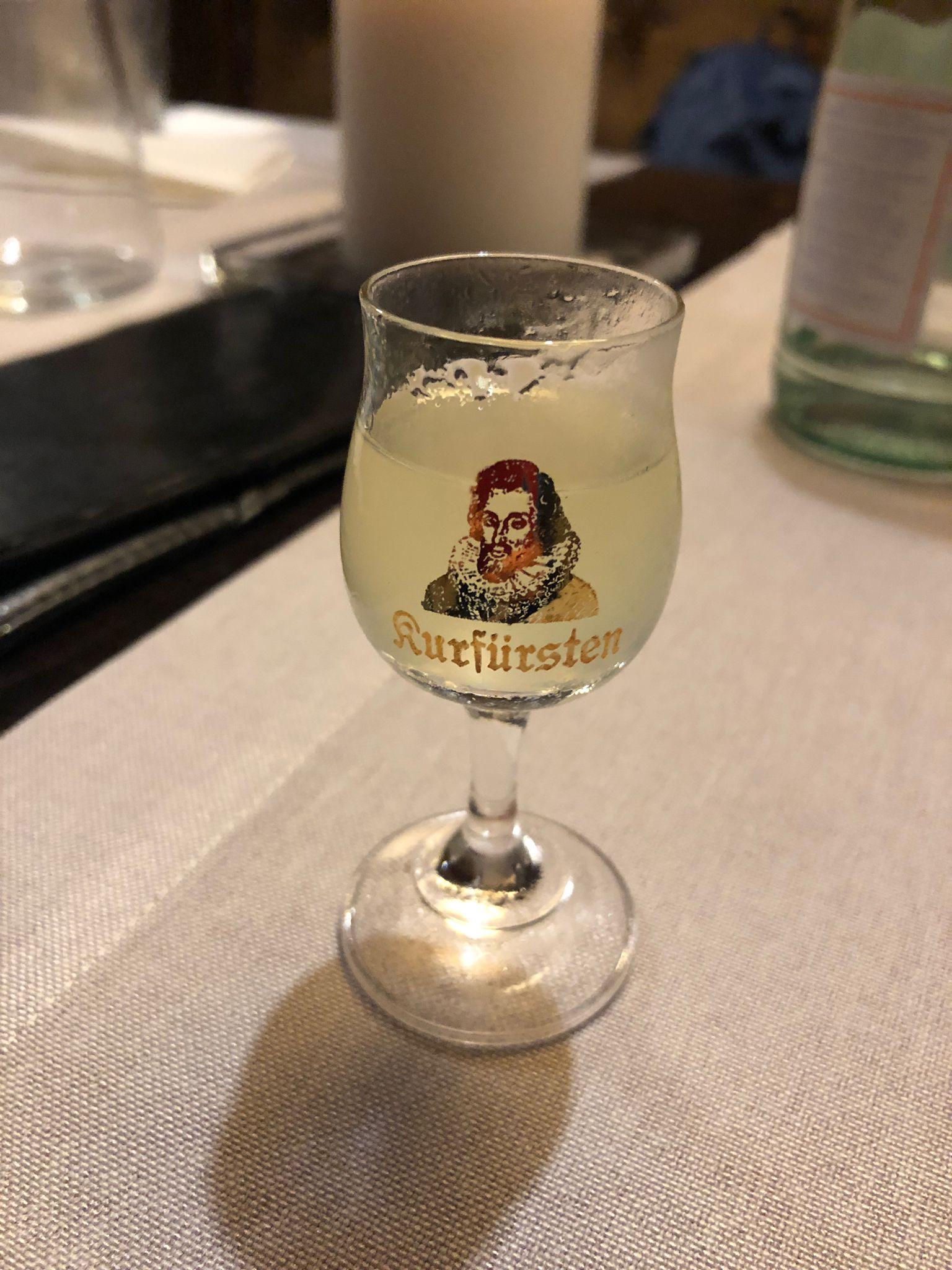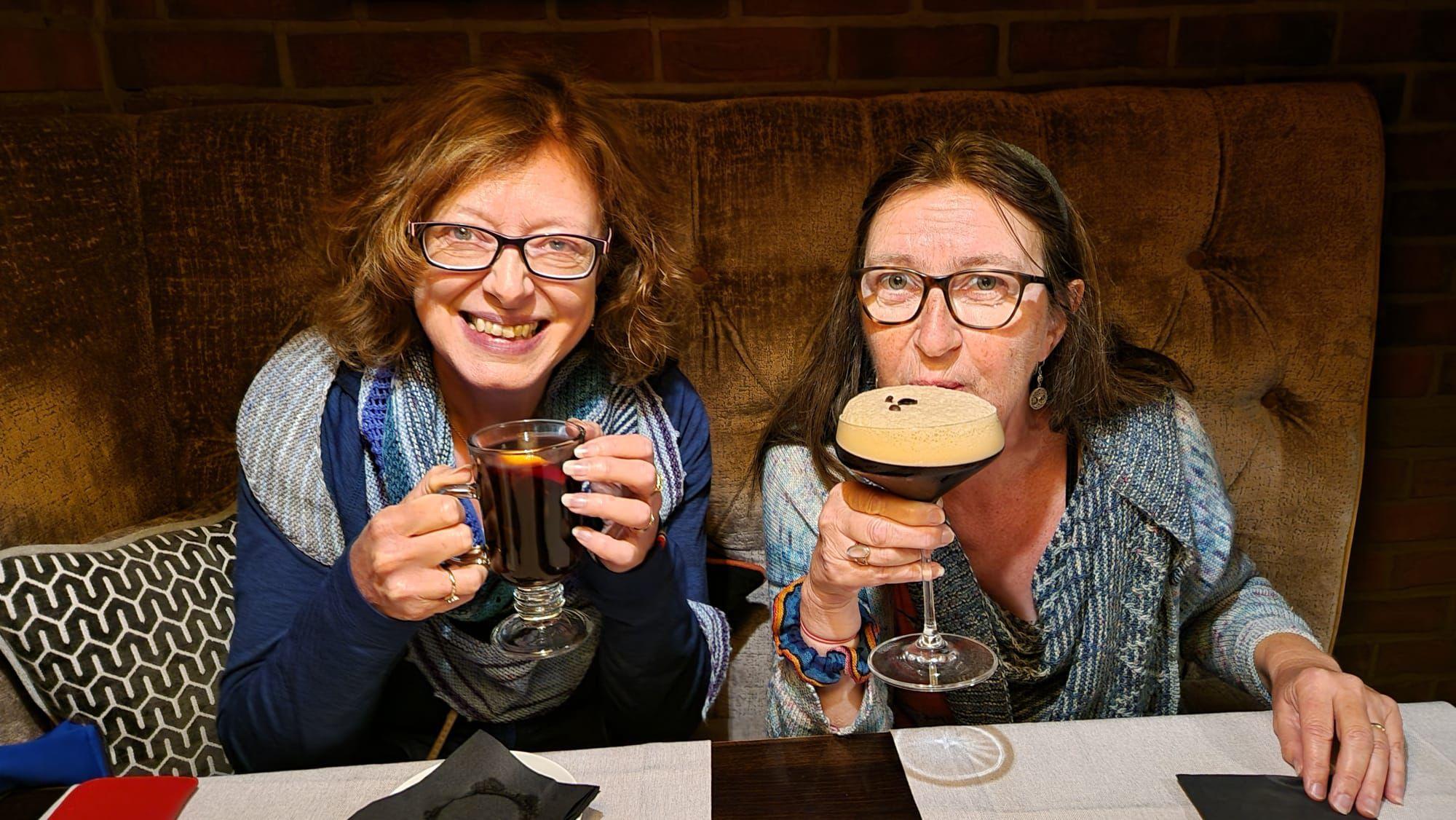 We arrived in the basilica again. We were in time to hear the clock chiming and she gave us tips on when to come to see the apostles on the move. She gave us a few other tips of other places to see. Even though the weather was not what we would have planned, and the timing later in the visit, it was still well worth going on it. She drew us under arches to huddle as the rain grew harder, and drew her tour to a hasty conclusion leaving out the last stop for our warmth and comfort, but giving an empassioned finish about fighting for freedom. The talk is free but the donations were generous. From there we scurried to an indoor venue named after one of the local drinks she had mentioned in the tour, Goldwasser, a liqueur with gold flakes in it. We found a snug spot and a waiter came to ask what he could do for us. We weren't sure if we were ready for dinner but would start with a drink. Having seen the weather the server showed us the drinks menu but also said that in addition they had a mulled wine available. Mugs was delighted. After some deliberation, Marion joined her. I was taken with the pick-me-up espresso martini.