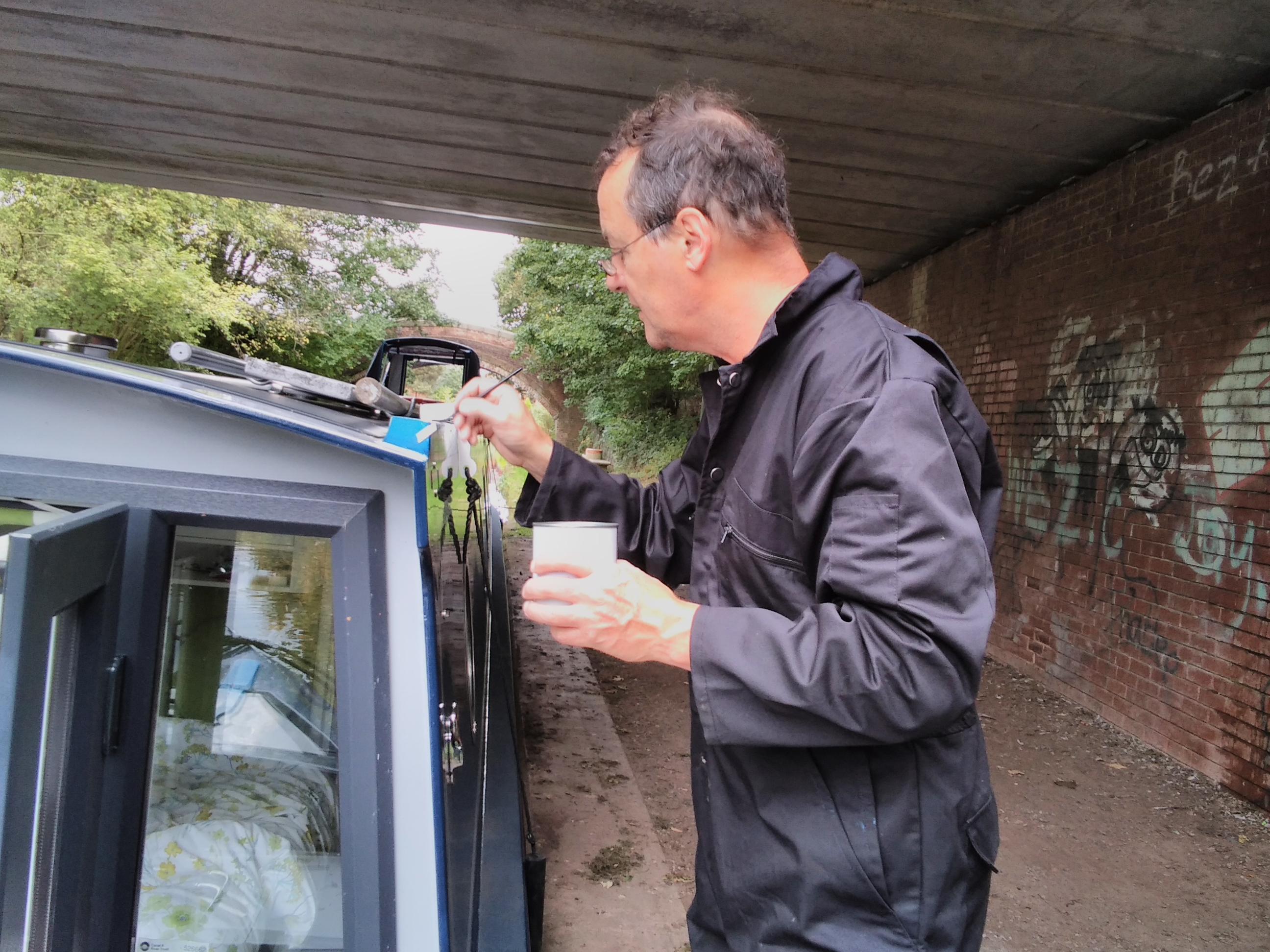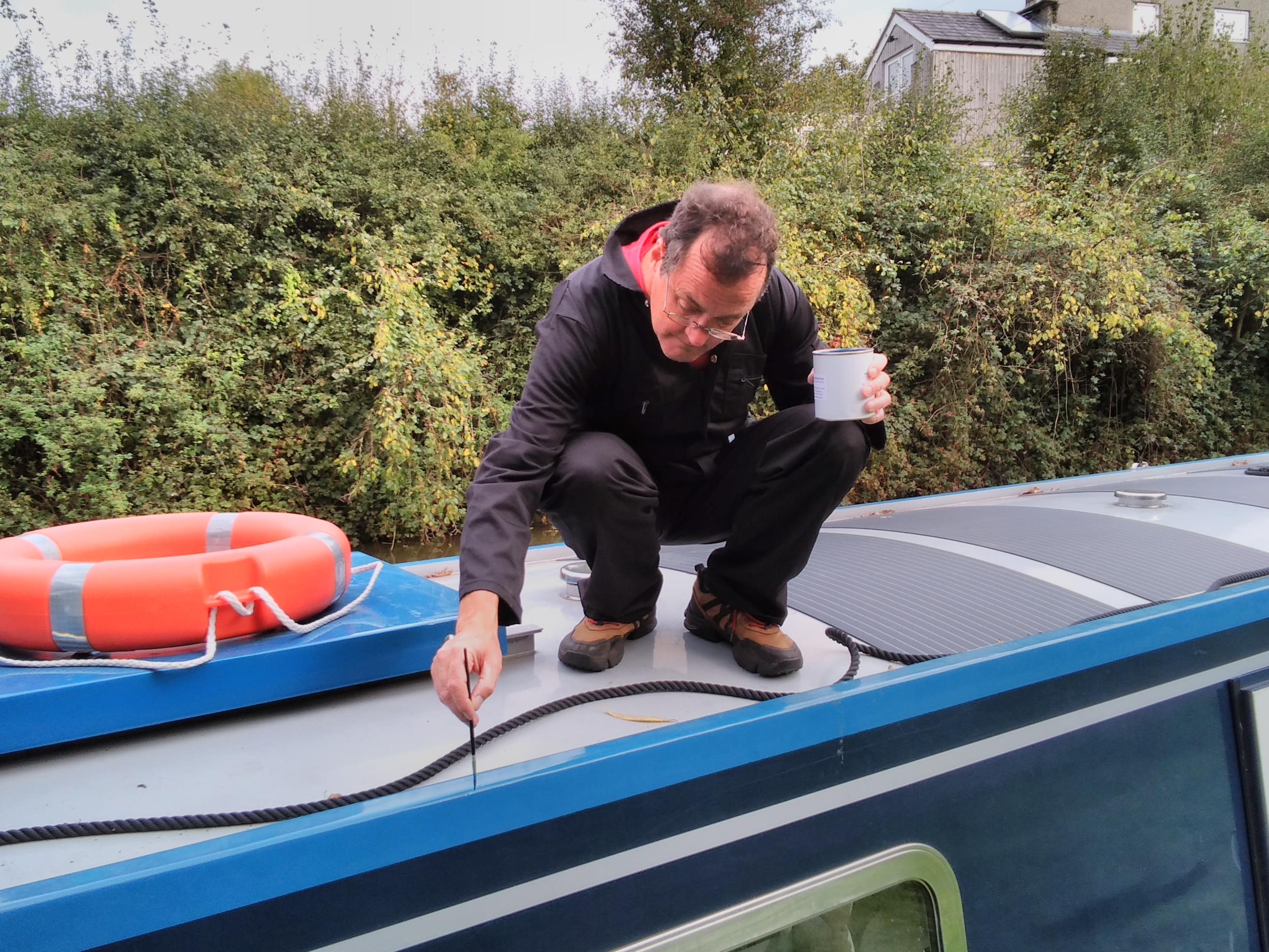 The fresh paint all over meant extra care was needed getting on and off the boat, placing fenders and pulling ropes. Last time we had not been moving the boat around much. Shane had offered to do ropes after I had cut my finger but it wasn’t a problem. As the time came to get through the tunnel, I was casting off and heading to remove the fender, when I slid and I saw I had stood in dog muck ( arrgh!). Just as I was hastily wiping my shoe, Shane, unaware, called for me to push the front off and jump on, as he was ready to go. Grasping the right bit of paintwork and pushing off and jump aboard avoiding stepping on tacky paint and weilding the rope clear rope and not getting the dirty shoe on anything…. I think I managed and slipped off the offending shoe to clear the treads using dry oak leaves that had made their way in the bow well, – handy – Then all went dark – unhandy – as we started into the tunnel. I took them both off, stepped inside and changed shoes.