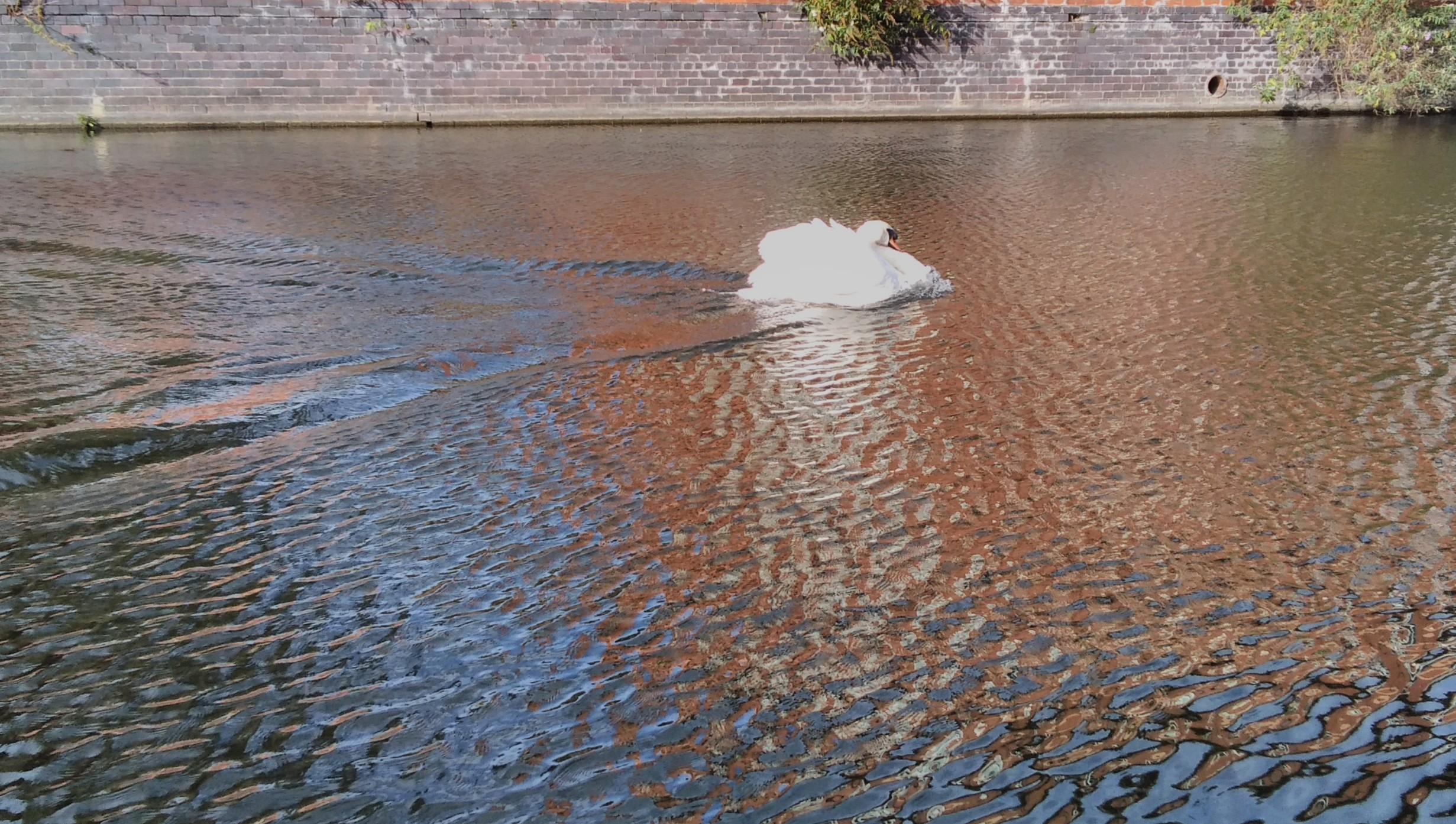 Some swans came past this morning but by the time I’d come out with food, they had sped past. They are powerful swimmers. I had the good luck today to see two swans flying down and arriving right before me on the water, wings outstretched, skimming along the surface then settling into swim mode. The male out flared his wings, displaying, and powered through the water. My camera didn’t do it justice, but he wasn’t gliding, he was making waves.