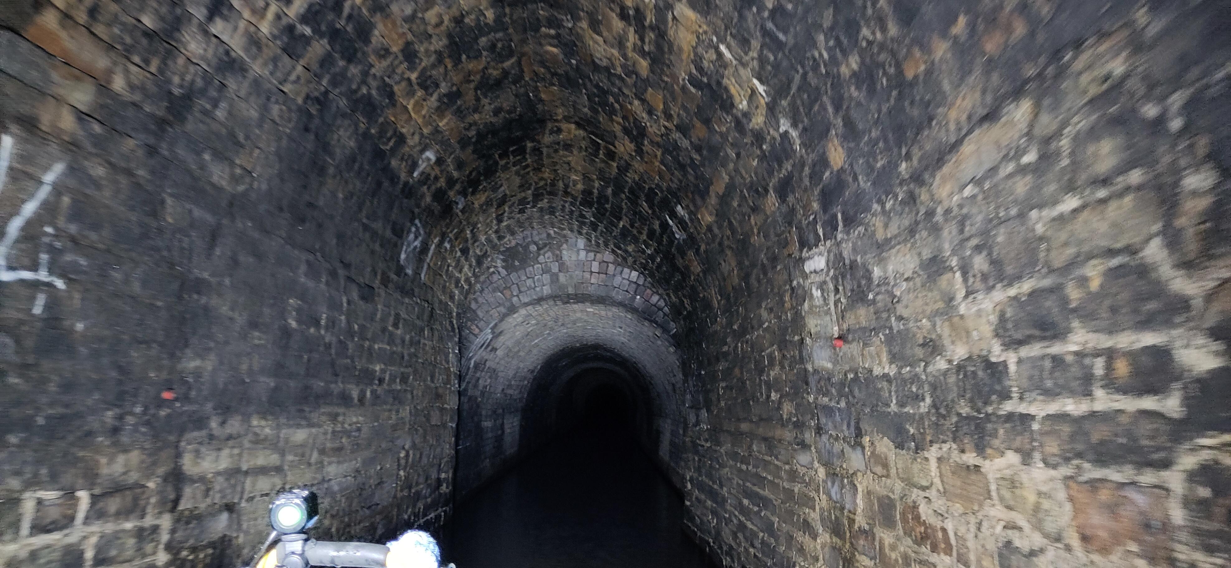 Trevor had warned me that there were a few places where the tunnel is very wet, mostly at the end we were starting from. We could hear the water before we could see it, but there was no way we were going to avoid it. This was the bottom of the shaft we’d seen yesterday. If I hadn’t been dressed for this it would have been miserable, but I was standing in a waterproof coat and hard hat, so I didn’t even feel it. There were a few more wet points like this, but the vast majority of the tunnel was not even drippy.