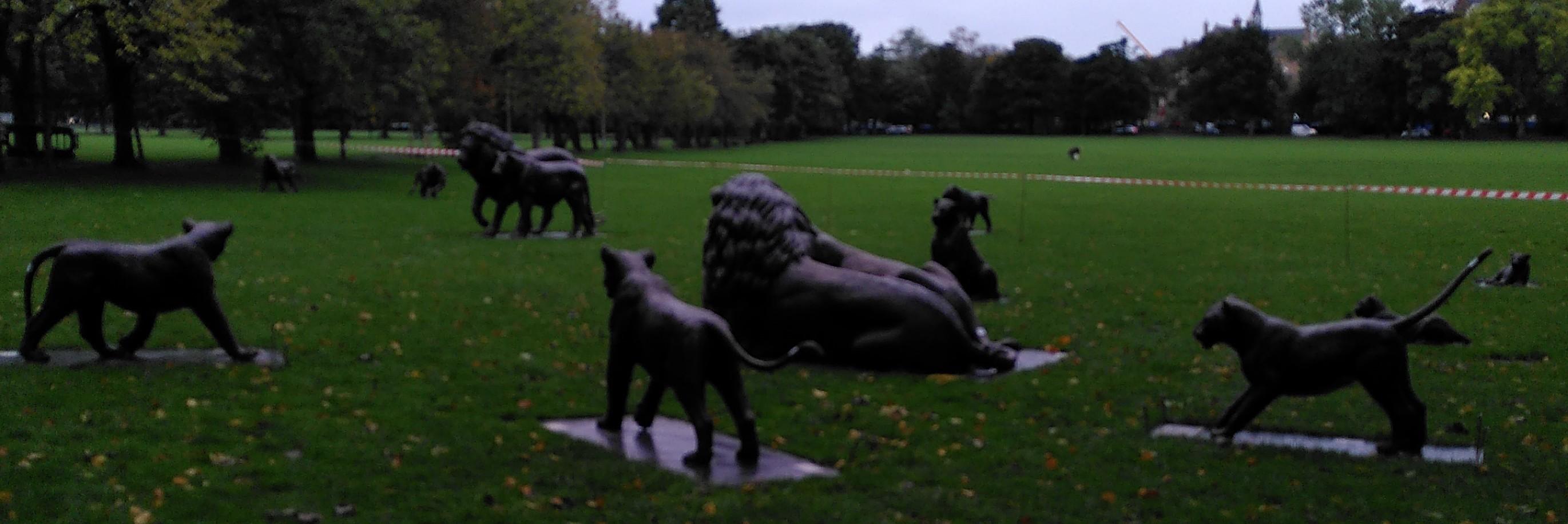 Shane had a scan in the afternoon too but rather later than my appointment. We crossed briefly with me coming back while he left for the hospital. On his return he was keen to share his interesting experience. Not the scan, no that was a bog standard, but the installation of multiple statues, in the Meadows, that was news! He had a chat with the workers about the great weight of each one – the small ones weigh quarter of a ton, and they had anti theft paint on them but who could steal a whole pride of lions? The red tape is no deterrent and is now removed but the lions are here till January. They have been to other places and will move on, so if you don’t aren’t here this year …..coming next year to a place near you… perhaps!