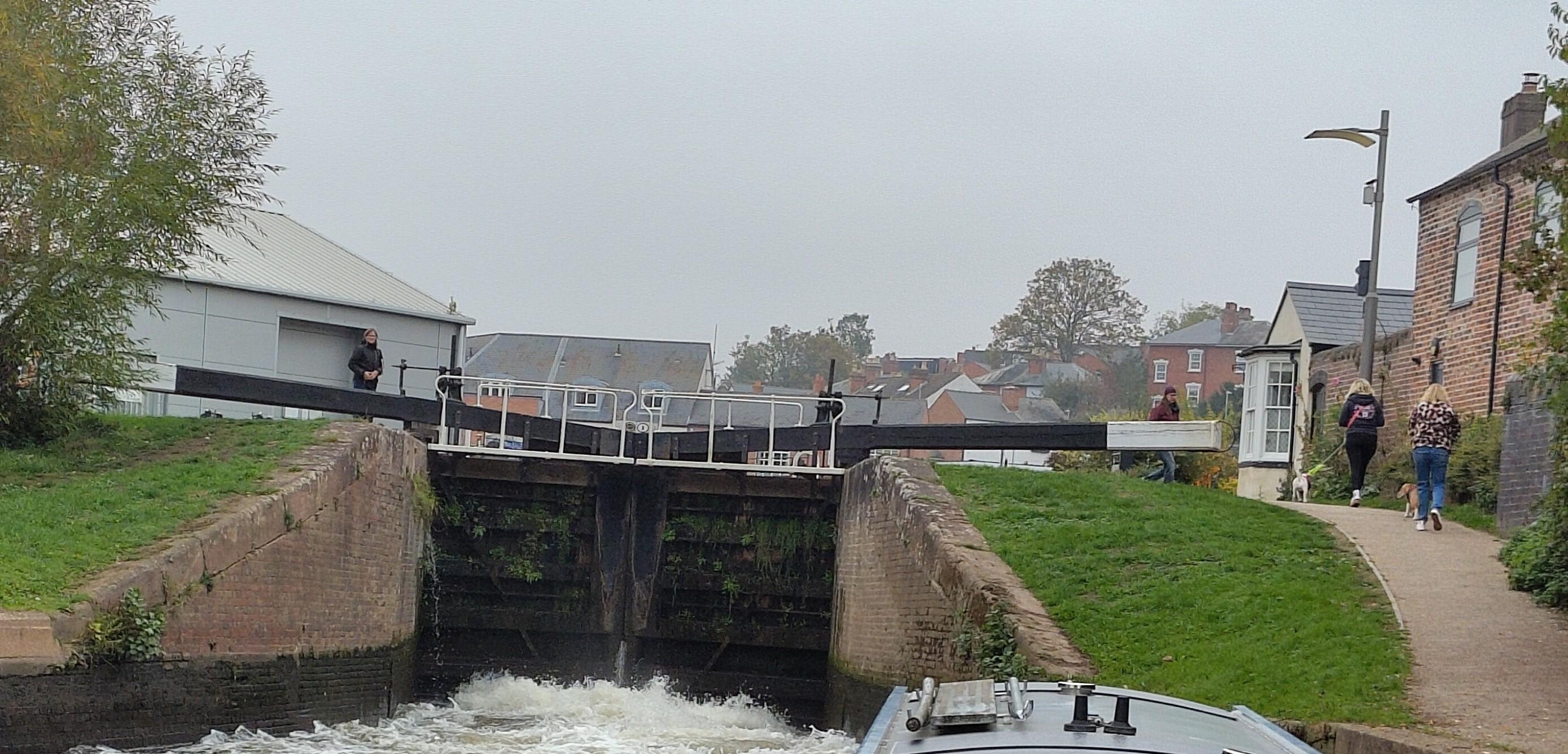 We were trying to charge the batteries again, so it wasn't long before we were very close behind. They pulled to the side and invited us to pass, which I happily accepted. They gradually vanished behind us as we covered the miles to the first lock. There had been no mooring options, and the lock bollards weren't suitable to stop on either. I suggested we prepare the lock, and then moor up inside it for lunch or until another boat arrived.