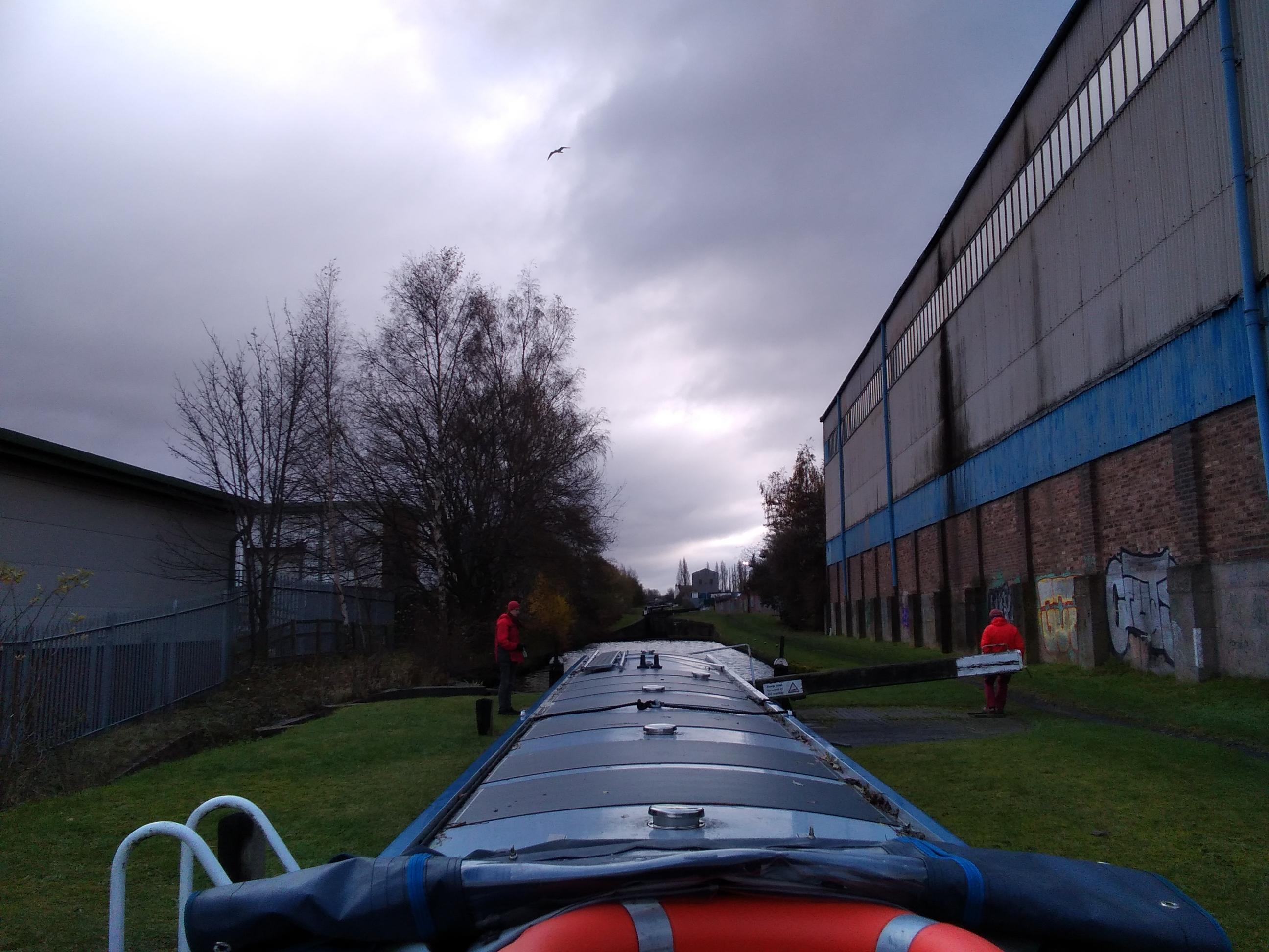 The second lock was the one where the gate had only just opened wide enough. At this one the boat also stopped halfway in. I gave it plenty of throttle which seemed to push water out of the lock. Then when I slackened off, the lock refilled and washed me in with it. I was pretty sure the rest would be easier, and I was getting cold, so I asked Clare to drive for a bit. Running ahead to open locks, sometimes just for the sake of it, was an excellent way to warm up.
