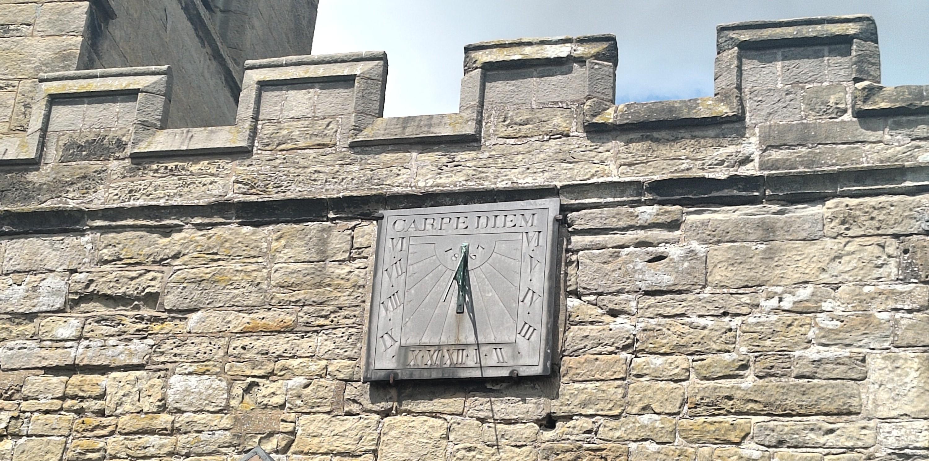 On closer inspection, the sundial had two scales, one for GMT and one for BST, but unfortunately the sky was cloudy so we couldn't read the time. The inscription was slightly different too, perhaps it means Chart the Day, but I'll settle for "Seize the Cart".