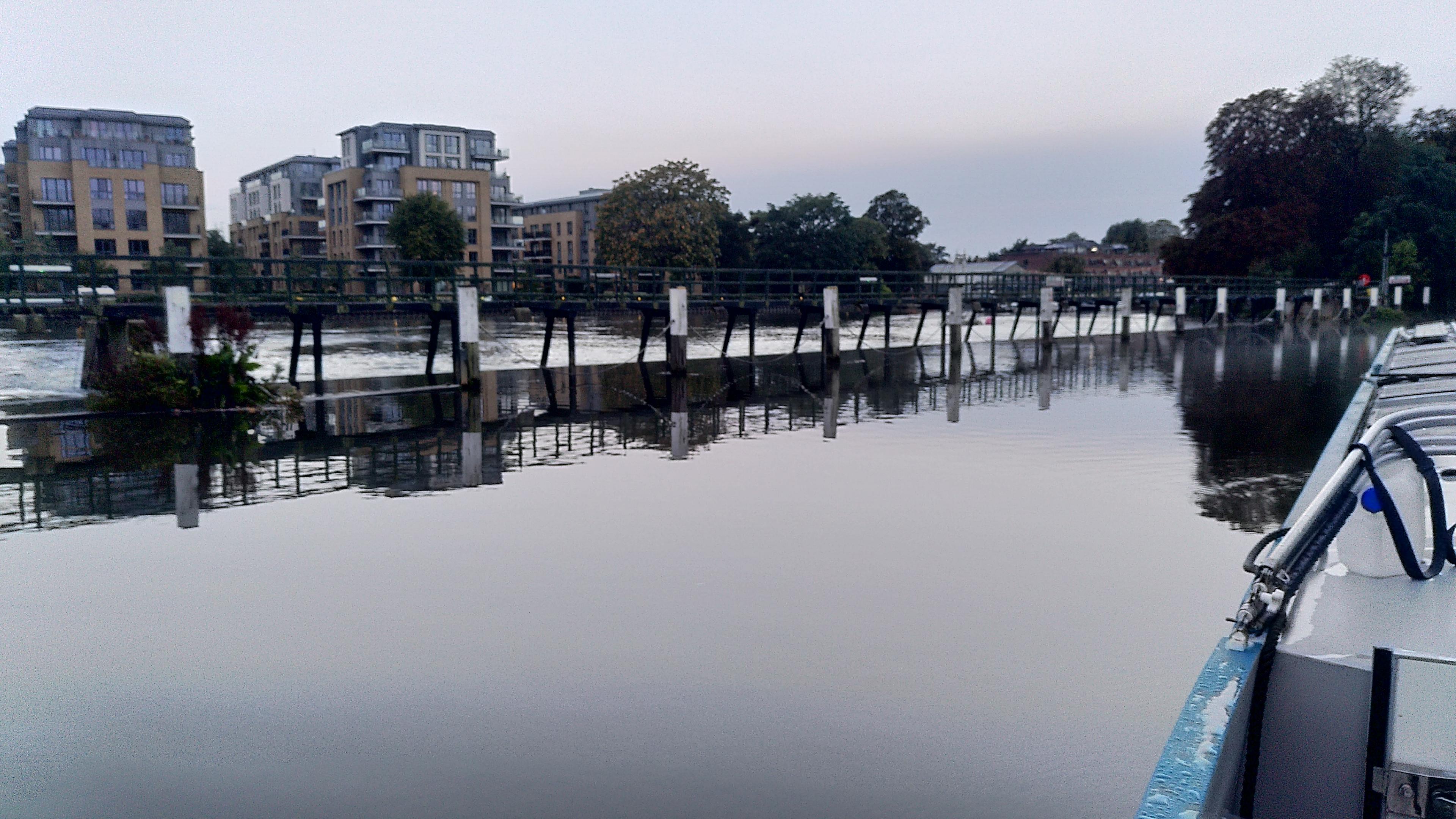 The Thames below Teddington Lock is tidal. Narrowboats can only safely traverse this section of the river around the time of high tide. When the tide is rushing in or out, the water moves faster than the top speed of our boat. We had a passage booked to leave the lock a little before high tide. For the previous few days, high tide has been before dawn and we are not equipped for travelling in those conditions.