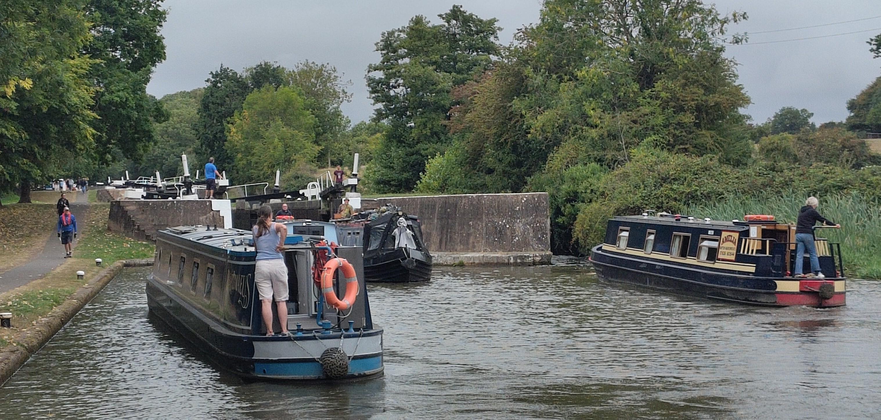 As we opened the gates of our second lock, we could see the next lock was ready with its gates open, and the other two boats were still moored at the side. There was a moment's indecision before Dean from Amelia suggested we "go for it!" So we recovered our "rightful" place ahead of the other two boats and, more significantly, with a clear run of empty locks ahead of us.