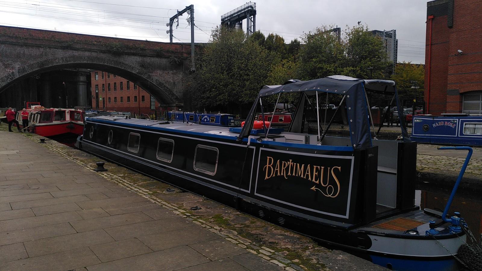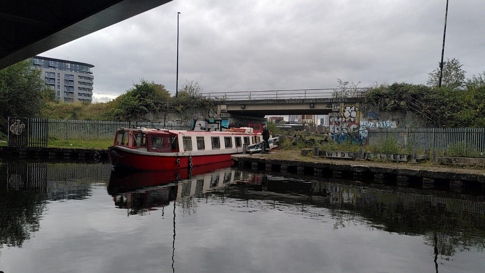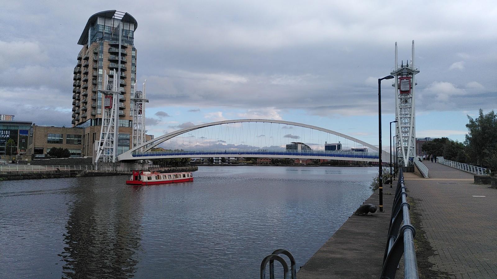 We walked back by a different route, starting by crossing the modern swing-bridge over the Manchester Ship Canal. While we were crossing, a boat driving under it caught our attention. We later saw it overtake us as it passed under the modern lift-bridge upstream.