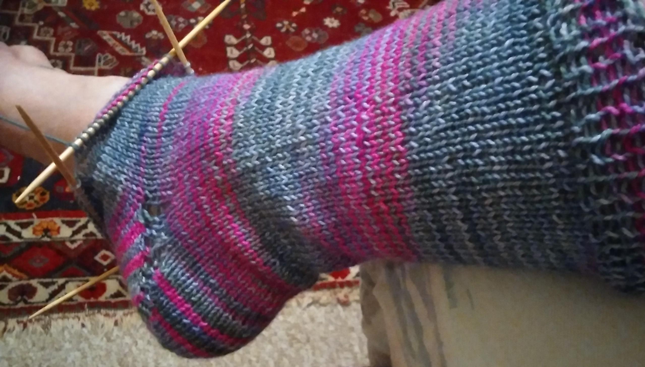 This morning there were lots of birds in the garden, gold finches, blackbirds, bluetits and they were very noisy, then I saw a spectacularly coloured cat slinking through the fence and realised the source of their stress. They were an interesting diversion for me, along with turning a heel for the first time, which required concentration. And of course there were all the well wishers. No time for pacing the floor at all.