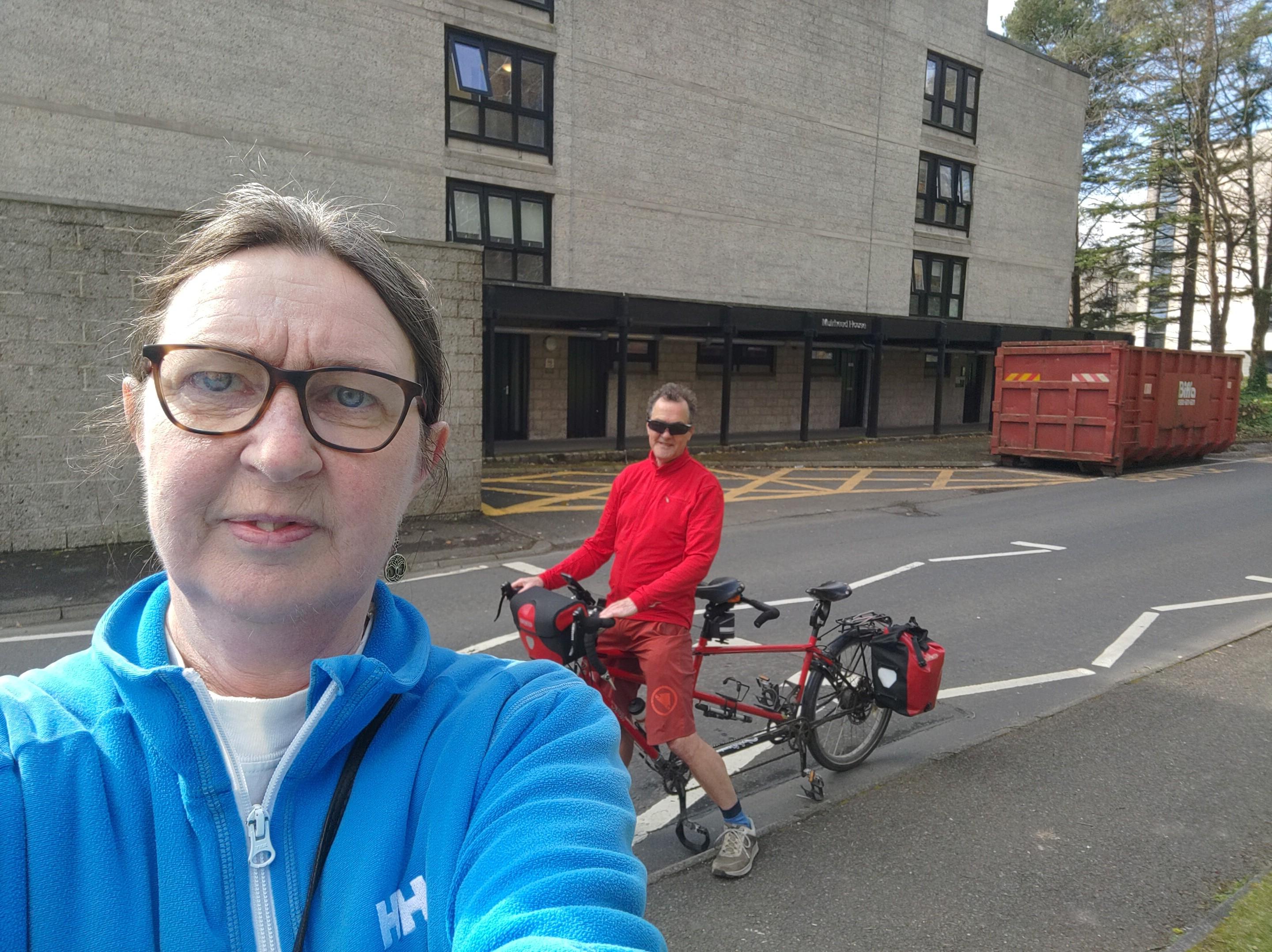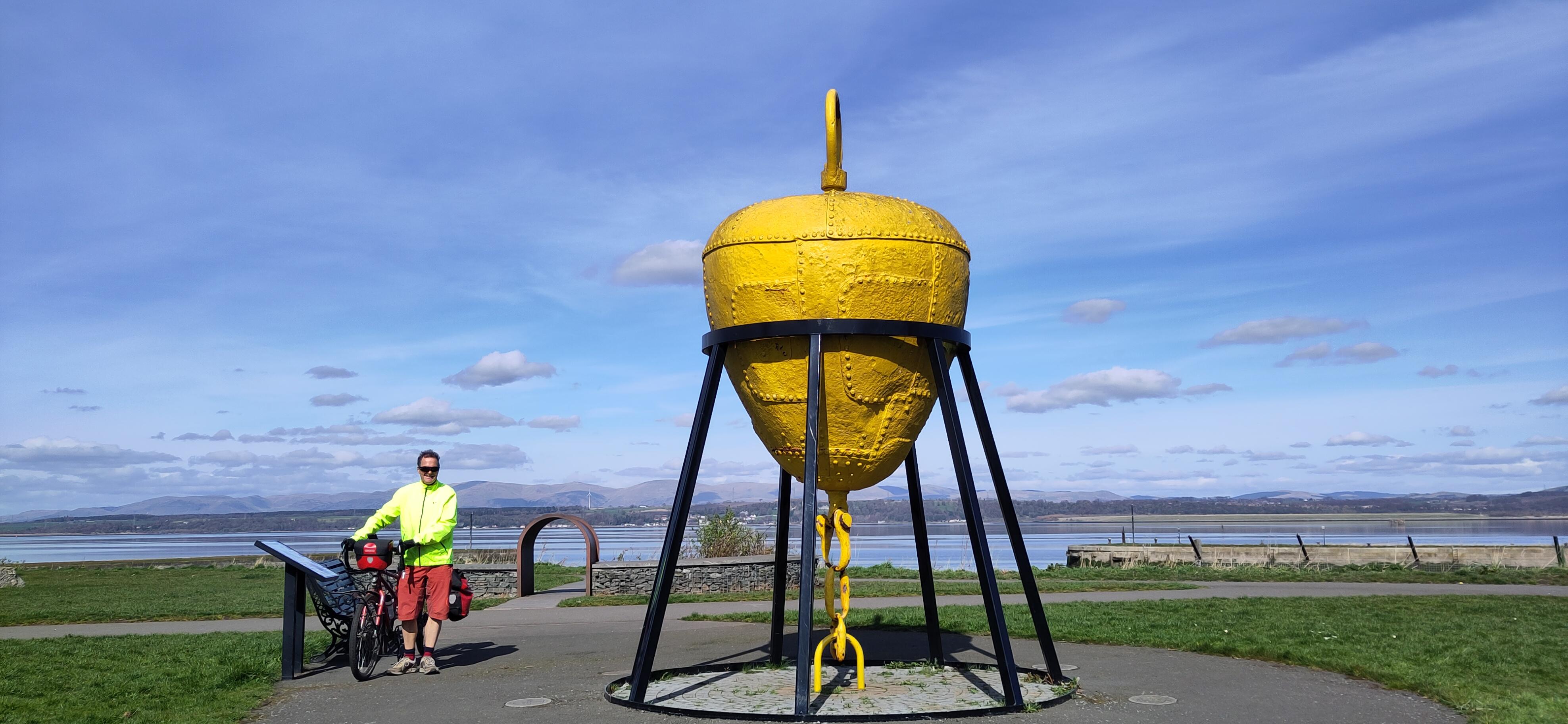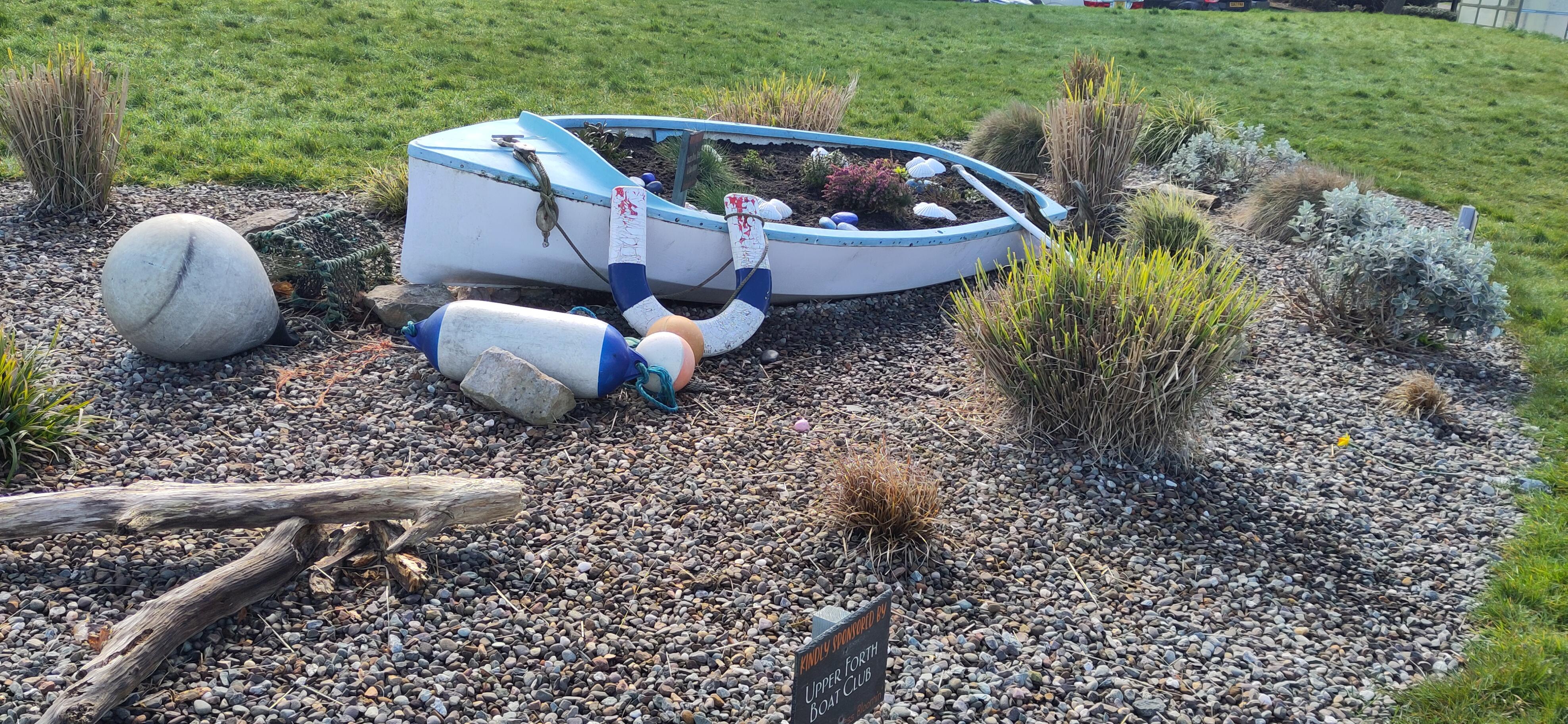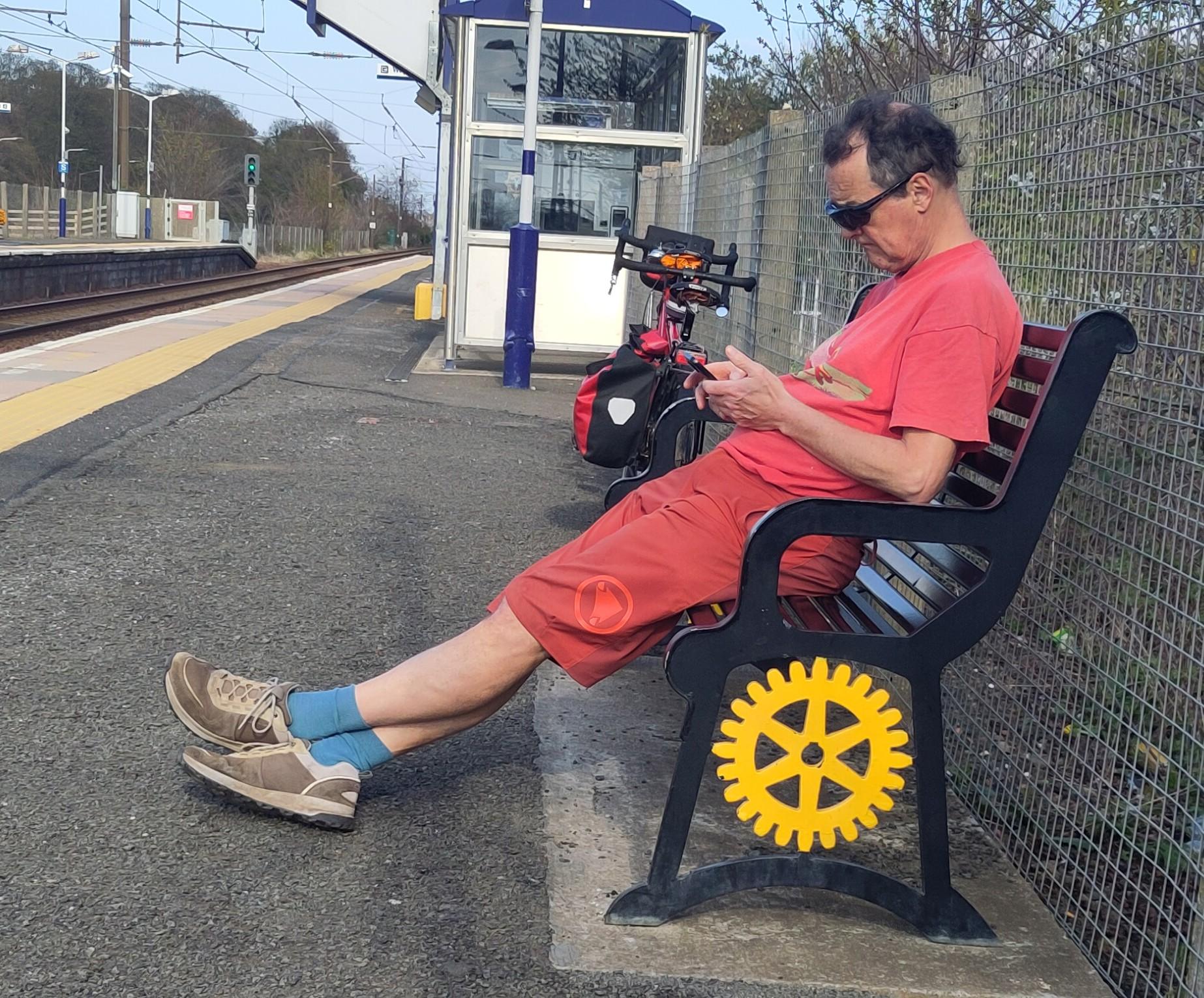 I had enjoyed a walk round Arthur's seat and in Dr Neil's garden on Easter Monday, the weather much improved from the snow on Sunday. It was brilliant today too and the view made Edinburgh look far away. We didn't cycle back though, we went on to Longniddry and waited for a train back. The design of the bench made it look like he might be on a wheelchair, not a bench, the symbol of the rotary club is a gear wheel, representing service and action, the spokes and cogs symbolising the importance of all the individuals working together, fitting for tandem riders.