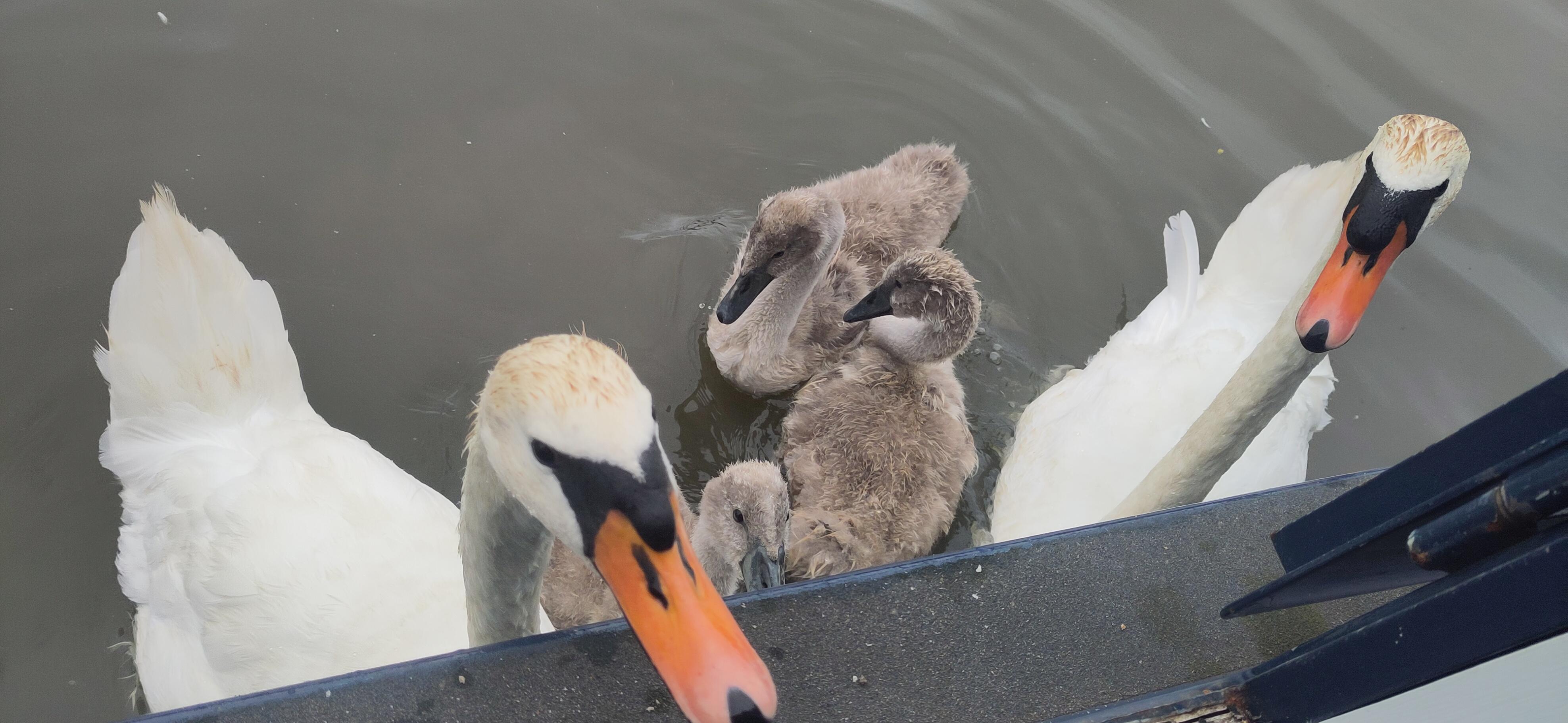 When we were stopped on Sunday, Shane was pleased to see some swans and cygnets come to the hatch. They hissed and splashed a bit at first, not the most friendly greeting, but were clearly enjoying getting fed. Shane even gave them some of his own home baked bread, a new experience for the swans. Shane got a surprise when the eager adult male, lunged for a beakful and got some of Shane's thumb along with it, not a chunk of flesh, just a scrape of skin, but enough to draw blood. He carried on feeding them, but threw from further back after that. The crumbs fell on them and they nibbled from each others backs, or their own.